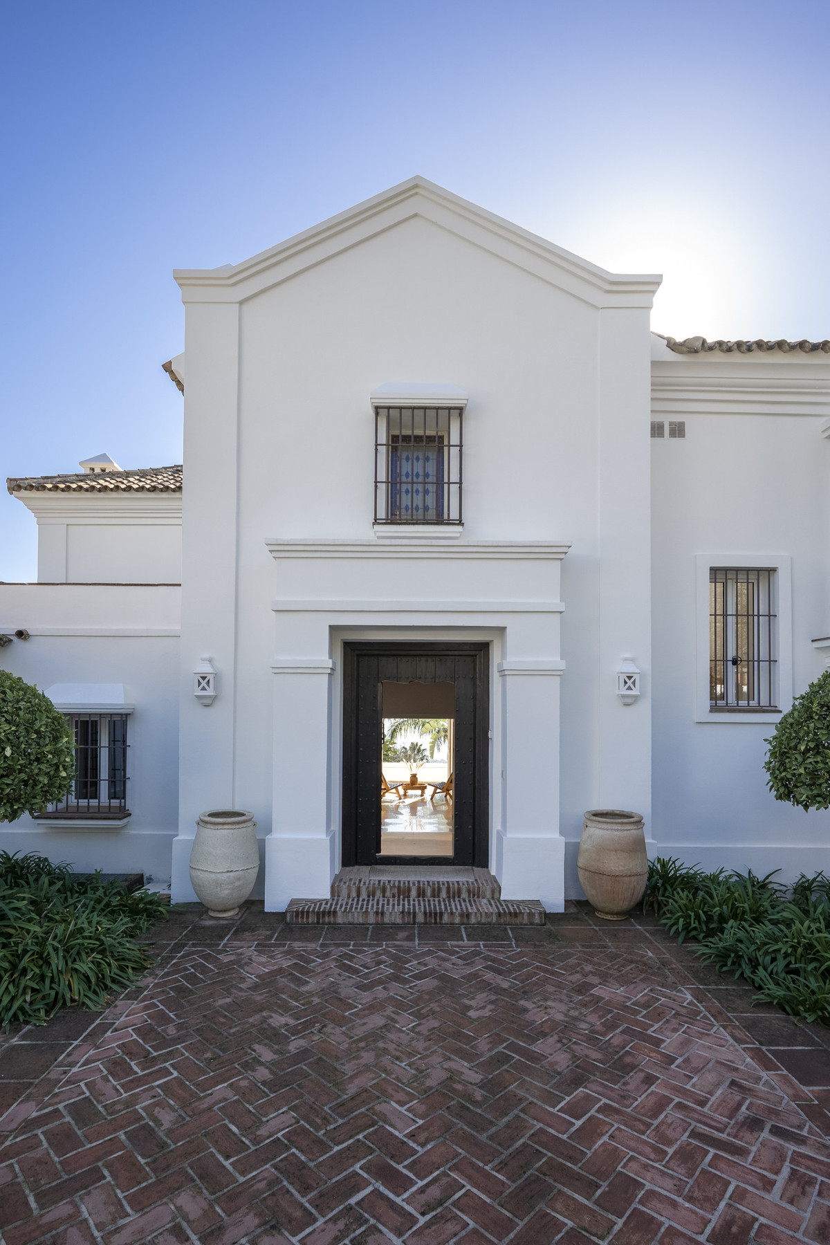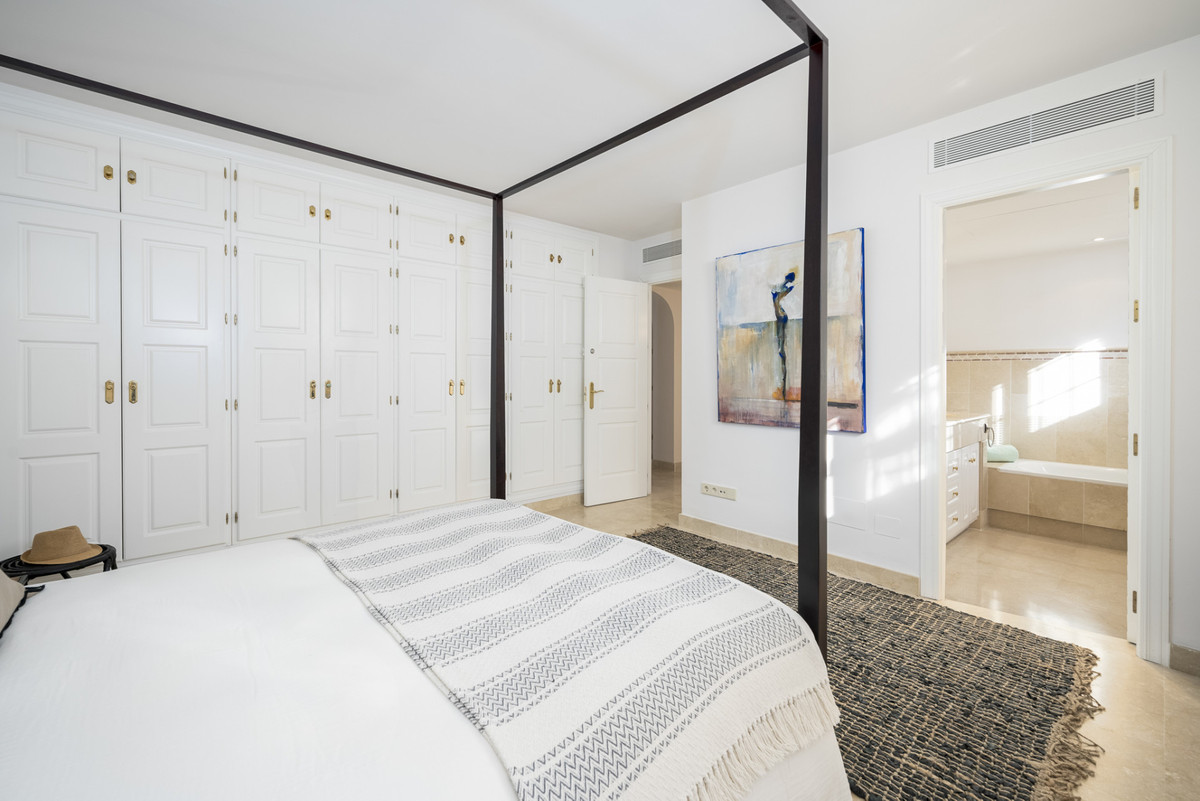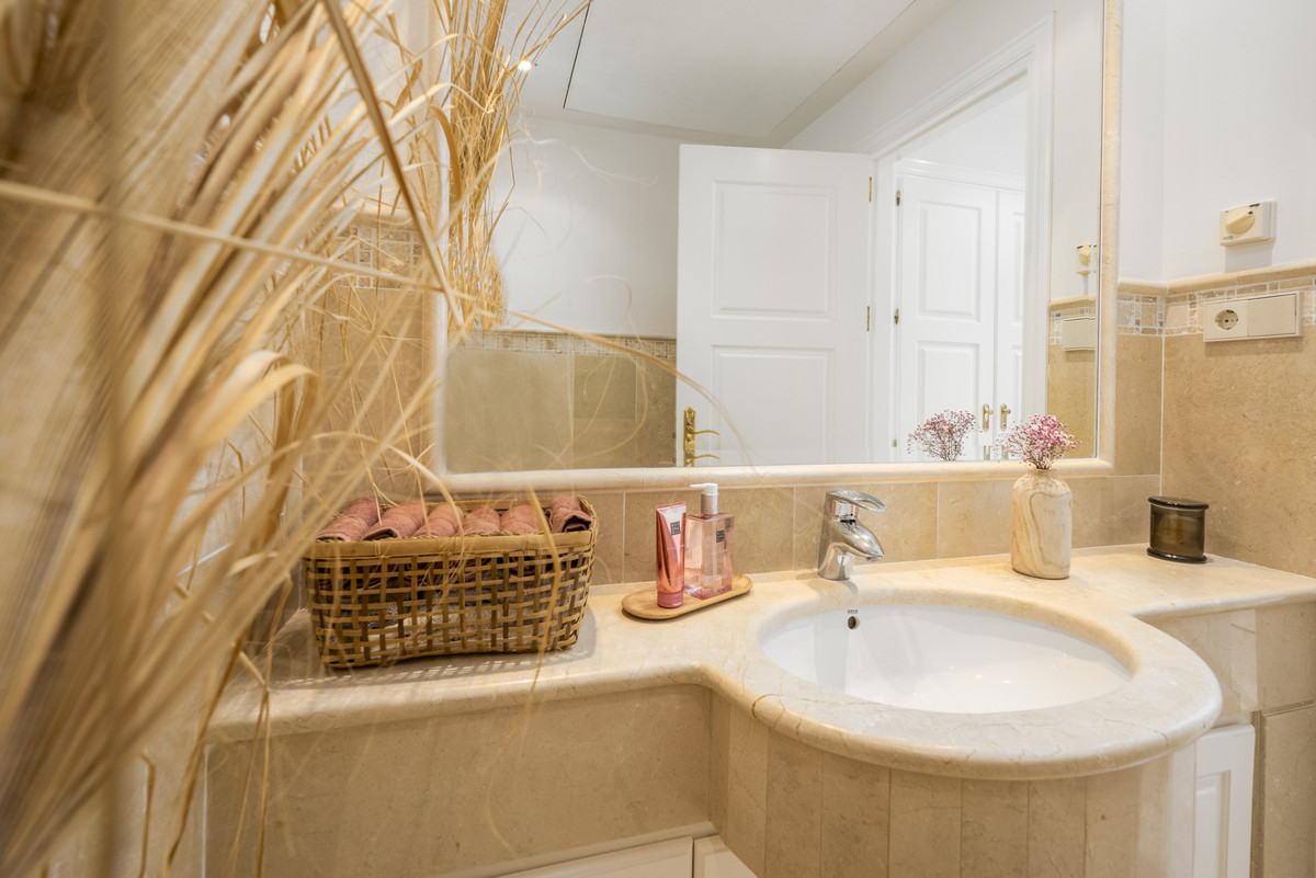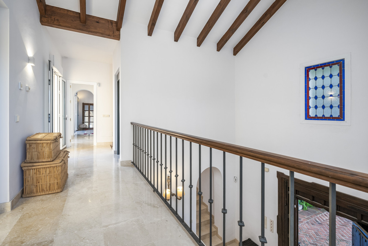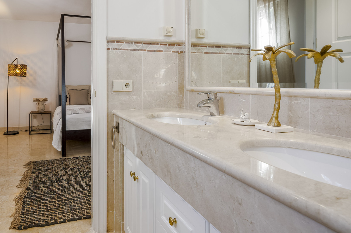 The villa's interior balances traditional Andalusian style with a hint of bohemian flair. Upstairs, the second level hosts a generous master bedroom, complete with a private terrace and an expansive en-suite bathroom featuring an open shower and bathtub. This floor also includes an additional en-suite guest room for convenience.