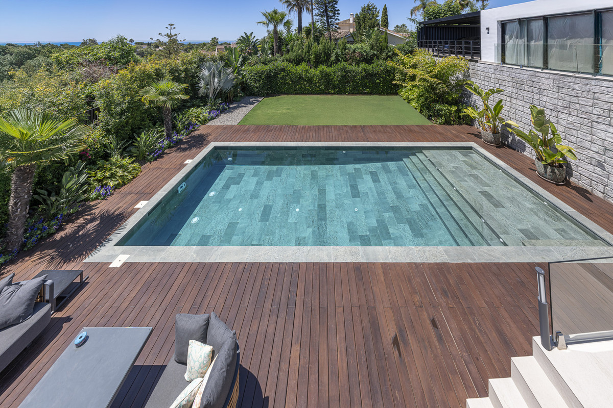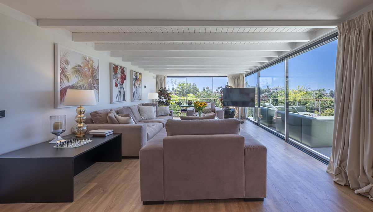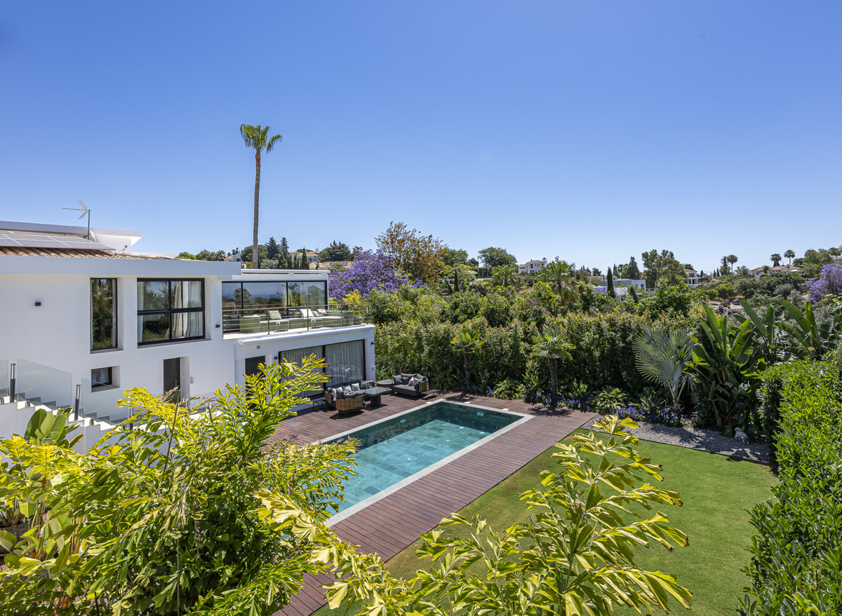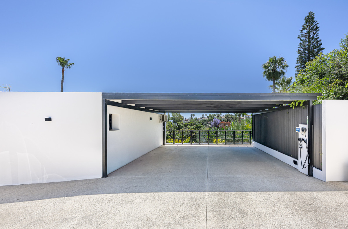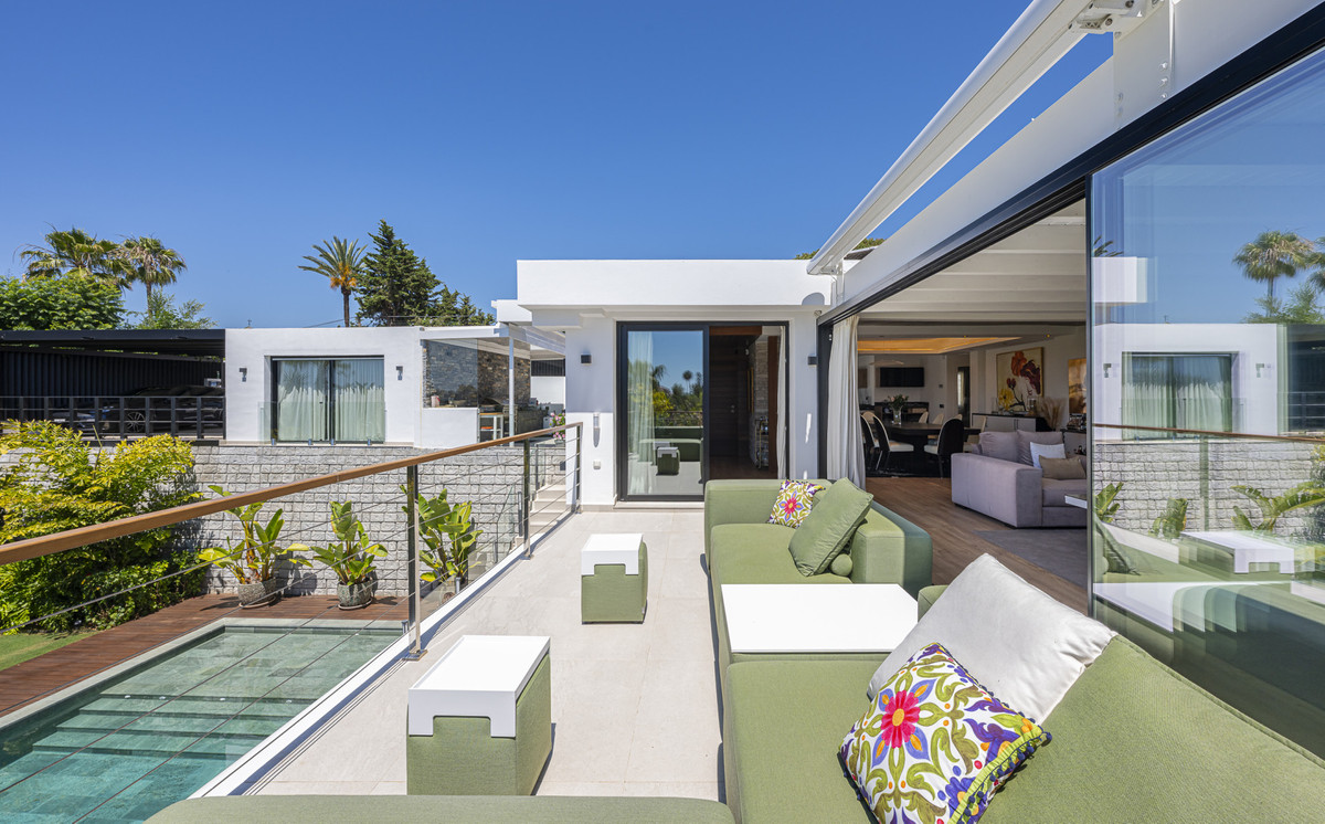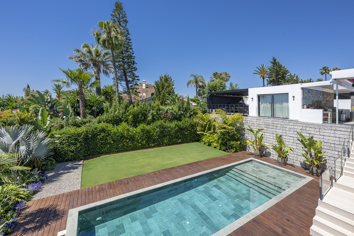 Presenting an exceptional villa in the sought-after El Rosario Urbanization on the esteemed Costa del Sol. This meticulously renovated property epitomizes luxury and stands as one of the premier residential areas on the eastern side of Marbella. Nestled in an enclave of villas surrounded by lush gardens, this residence prioritizes serenity. The villa boasts nearly 310 m2 of living space on a 1,065 m2 plot, featuring a pool, solarium, terraces with a covered outdoor kitchen, garden areas, and a covered garage.