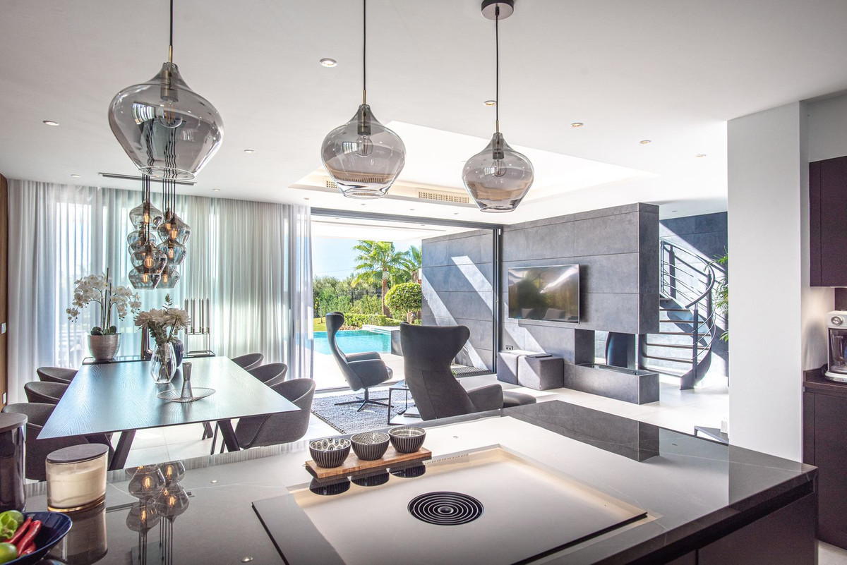 The villa features a generous terrace with a sunken lounge and fire pit, complemented by a private pool and an outdoor kitchen equipped with a gas BBQ, hot/cold tap, and dining area. From here, you can enjoy breathtaking views of the Mediterranean Sea and the golf course. Upstairs, a sophisticated master suite opens onto its own terrace with gorgeous views. The impressive basement level is designed for entertainment, offering a TV area, wine bodega, and a cinema room. The property has been carefully designed with energy efficiency in mind. It features a state-of-the-art domotic system that controls interior and exterior lighting, air conditioning, a heat pump for the swimming pool, intercom, and alarm system. A 16-panel photovoltaic solar energy system powers the villa, with smart monitoring via an app to track consumption and store excess energy in a private power bank. Every detail has been thoughtfully considered, giving this villa the perfect blend of style and sophistication - ready to impress even the most discerning buyer.