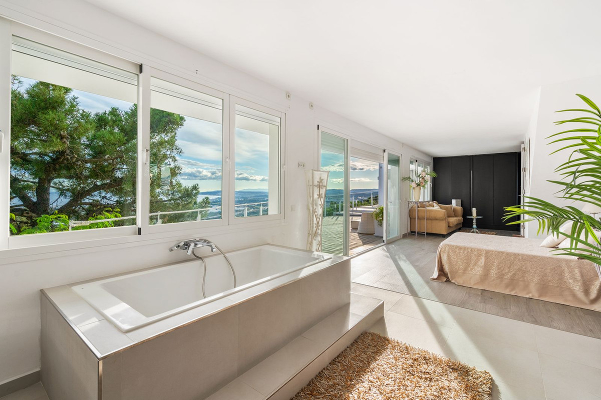 The interior spaces harmonize perfectly with the exterior. Imagine a fantastic living room with a winter garden, panoramic windows and a transparent dome that transforms the space into a true oasis. The magnificent kitchen, designed with a wonderful island and fireplace, offers stunning views of the Mediterranean. The two suites, each approximately 45 m² in size, are unique and singular, while the five double bedrooms, very bright and elegantly decorated, are ideal for families or guests.