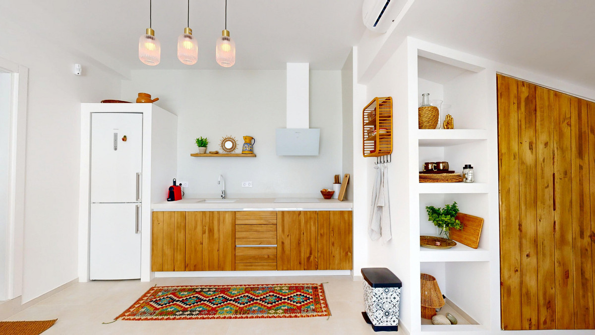 The main residence includes a spacious living room with a traditional Andalusian fireplace, a handcrafted open-plan kitchen with solid wood cabinets and brand-new top-quality appliances, two bedrooms with en-suite bathrooms, and a guest toilet. Both the living room and kitchen open onto a large sunny terrace and a fully renovated private pool, surrounded by lush gardens with an automatic irrigation system and new outdoor lighting.