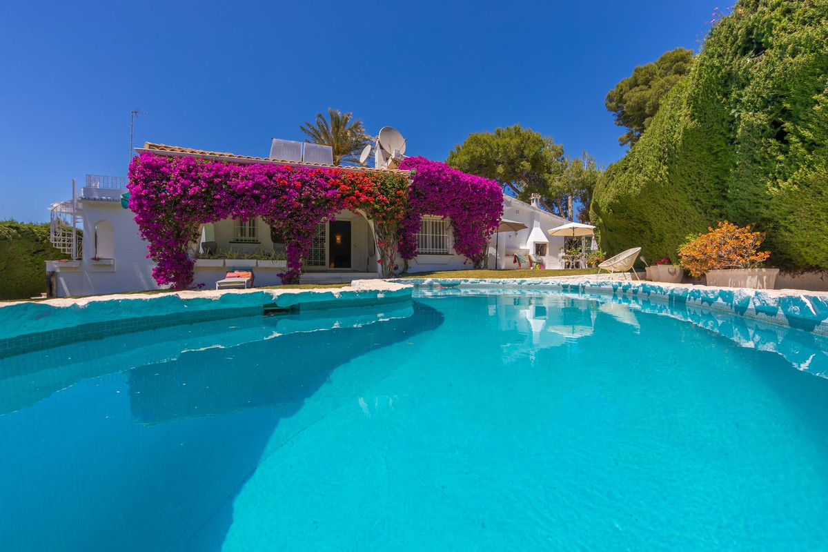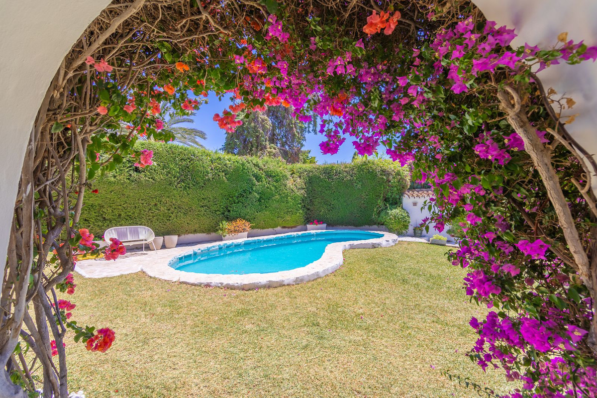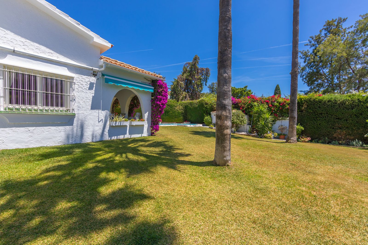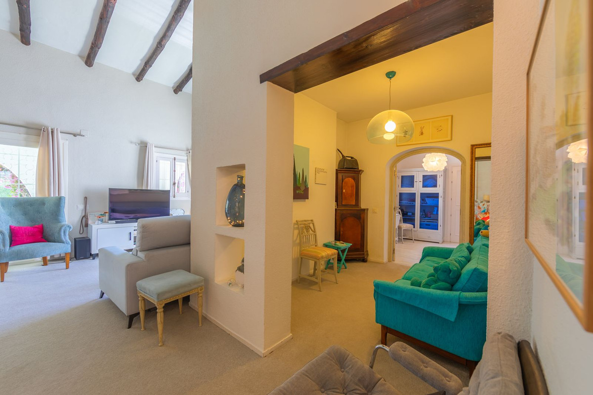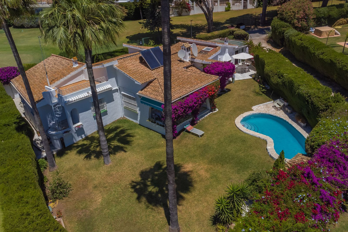 VILLA WITH ATTRACTIVE AND BEAUTIFUL MEDITERRANEAN CHARACTER, DISTRIBUTED ON A COMFORTABLE GROUND FLOOR AND LOCATED ON THE FIRST LINE OF GOLF, OF THE PRETIGIOUS REAL CLUB DE GOLF DE GUADALMINA. Located in a corner, in a cul de sac, located by the 18th Tee of the south . Enjoy a beautiful mature garden, very well maintained, with a multitude of trees and plants. LOCATED, 2 km from San Pedro de Alcántara and 6 km from Puerto Banús. Estepona and Marbella 15 min. Restaurants, Shops, and Leisure Areas just a 10-minute walk away and the beach a 5-minute drive away. Completely surrounded by Golf Courses and just a 3-minute walk from the golf clubhouse. (Golf share optional). Enjoy complete tranquility and privacy. South facing with great light and relaxing views of its excellently maintained mature garden and pool. It has a parking area for 2 cars at the entrance of the house plus a closed garage. In good condition and magnificently built, this property is distributed on a very comfortable single level. With a living room with high ceilings with wooden beams and direct access to the porch, garden and the kidney-shaped pool. The master bedroom en-suite with dressing room and direct access to the garden. A large and very bright kitchen with also high beamed ceilings and a dining area located next to the access to the parking area. The other good size bedrooms share 2 full bathrooms. The home has the option of separating an apartment by a door. From the cozy solarium enjoy relaxing views of the garden, golf courses and mountains. It also features a semi-basement with access from outside the house that could be used as a gym, games room, etc. It has great possibilities to change its distribution. We highly recommend visiting this fantastic property.