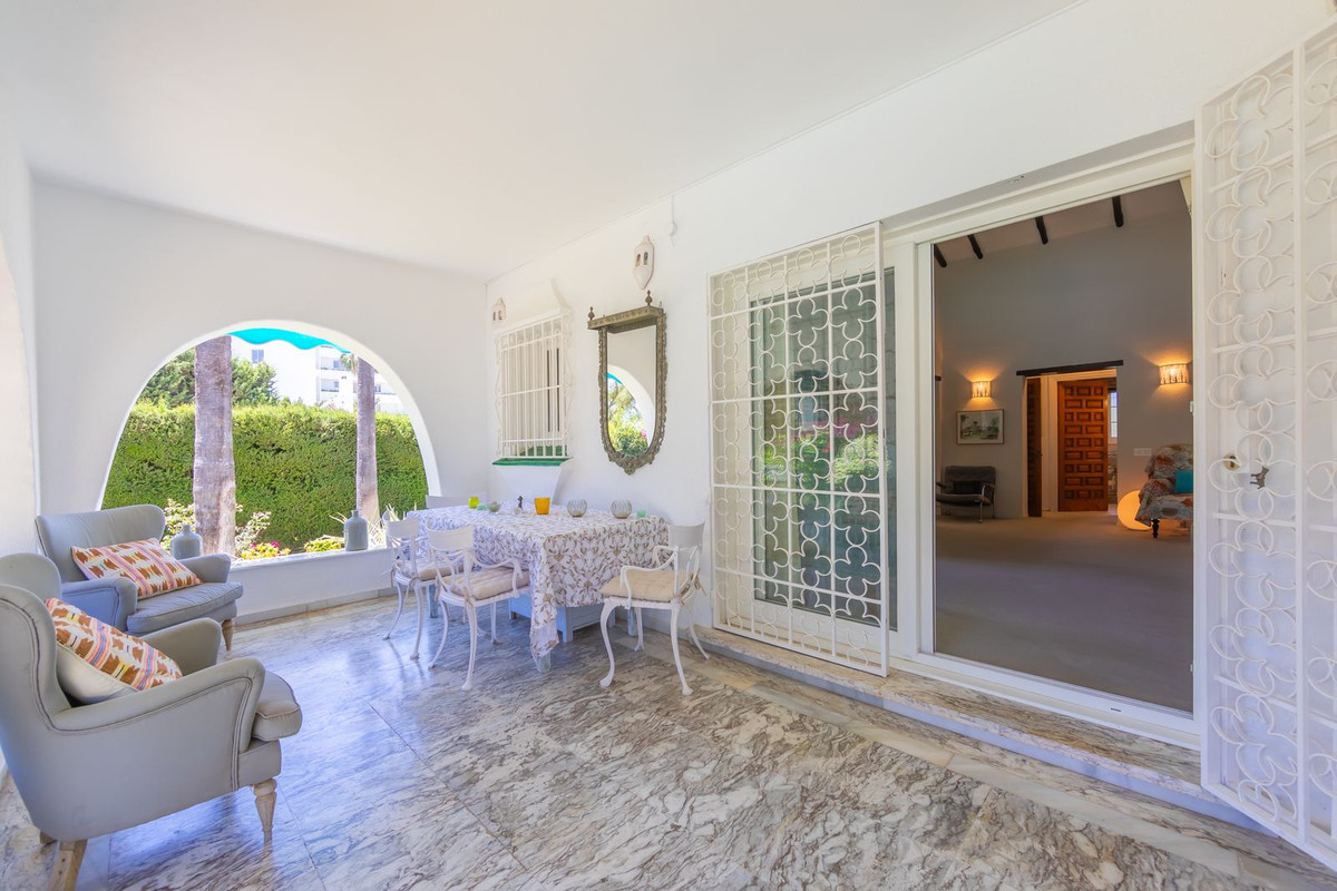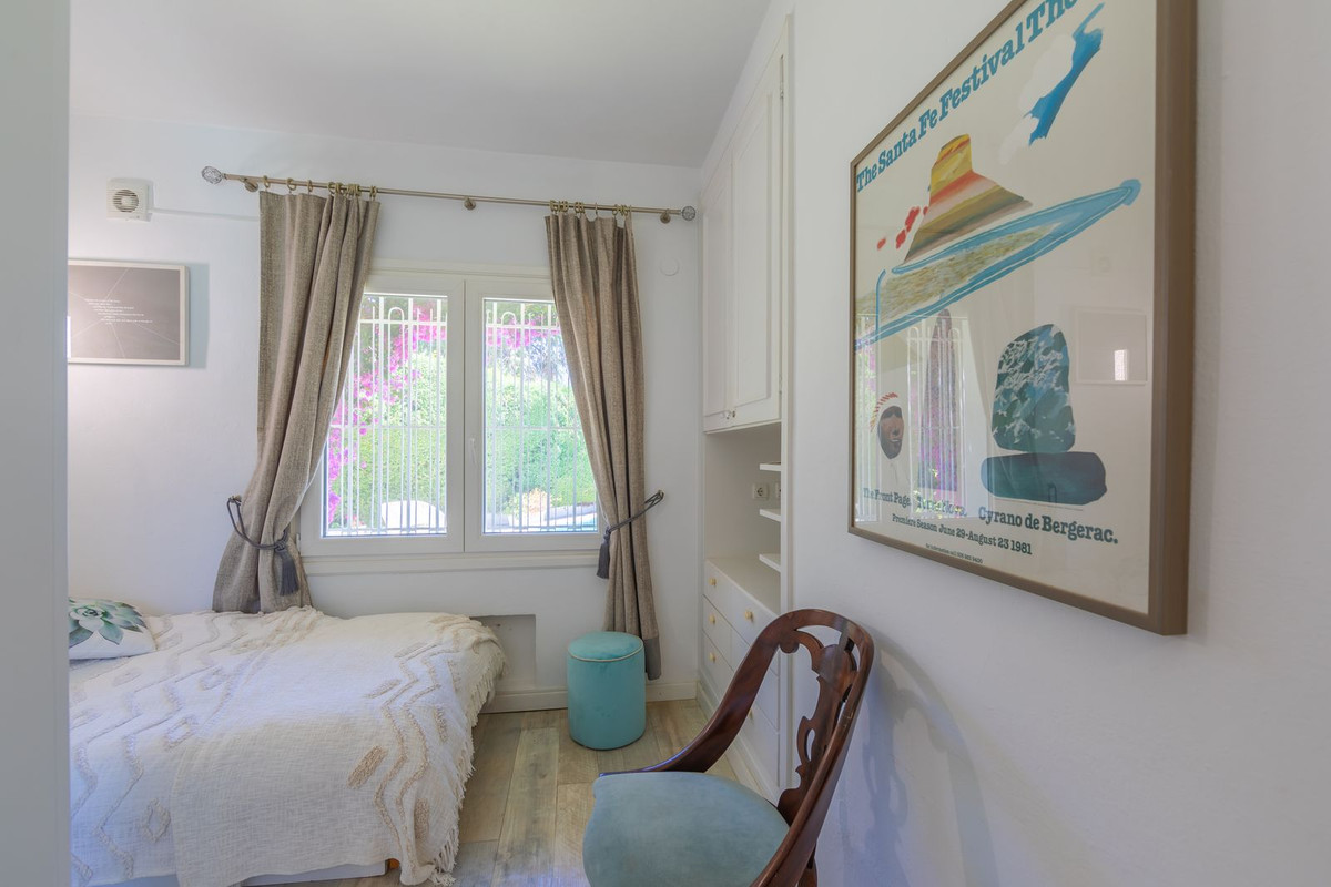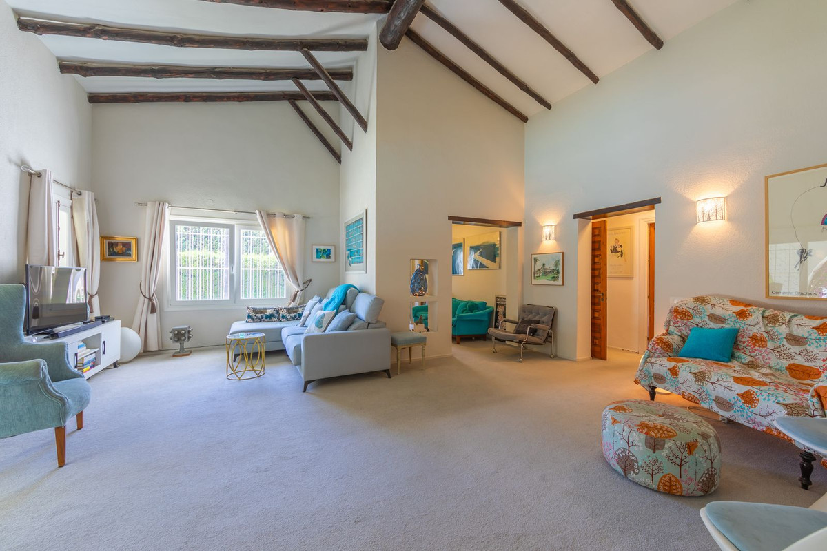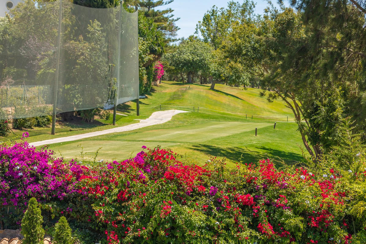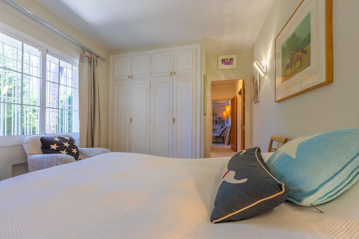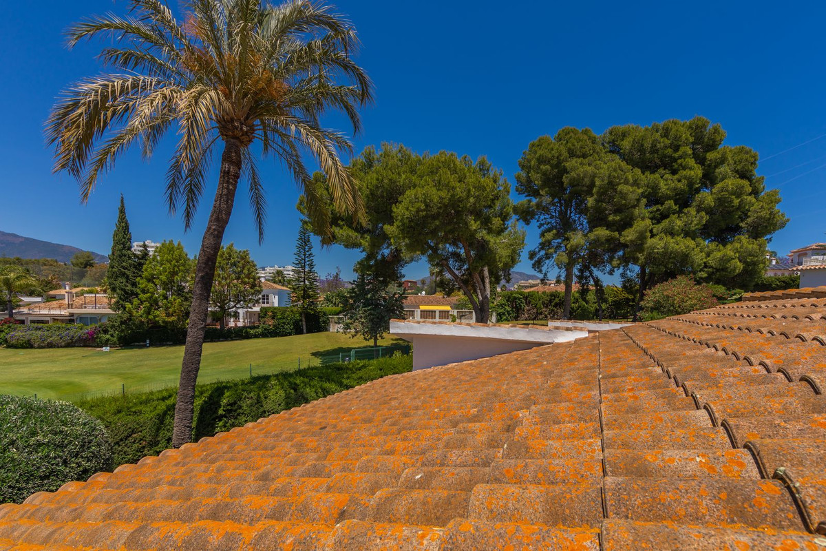 VILLA WITH ATTRACTIVE AND BEAUTIFUL MEDITERRANEAN CHARACTER, DISTRIBUTED ON A COMFORTABLE GROUND FLOOR AND LOCATED ON THE FIRST LINE OF GOLF, OF THE PRETIGIOUS REAL CLUB DE GOLF DE GUADALMINA. Located in a corner, in a cul de sac, located by the 18th Tee of the south . Enjoy a beautiful mature garden, very well maintained, with a multitude of trees and plants. LOCATED, 2 km from San Pedro de Alcántara and 6 km from Puerto Banús. Estepona and Marbella 15 min. Restaurants, Shops, and Leisure Areas just a 10-minute walk away and the beach a 5-minute drive away. Completely surrounded by Golf Courses and just a 3-minute walk from the golf clubhouse. (Golf share optional). Enjoy complete tranquility and privacy. South facing with great light and relaxing views of its excellently maintained mature garden and pool. It has a parking area for 2 cars at the entrance of the house plus a closed garage. In good condition and magnificently built, this property is distributed on a very comfortable single level. With a living room with high ceilings with wooden beams and direct access to the porch, garden and the kidney-shaped pool. The master bedroom en-suite with dressing room and direct access to the garden. A large and very bright kitchen with also high beamed ceilings and a dining area located next to the access to the parking area. The other good size bedrooms share 2 full bathrooms. The home has the option of separating an apartment by a door. From the cozy solarium enjoy relaxing views of the garden, golf courses and mountains. It also features a semi-basement with access from outside the house that could be used as a gym, games room, etc. It has great possibilities to change its distribution. We highly recommend visiting this fantastic property.