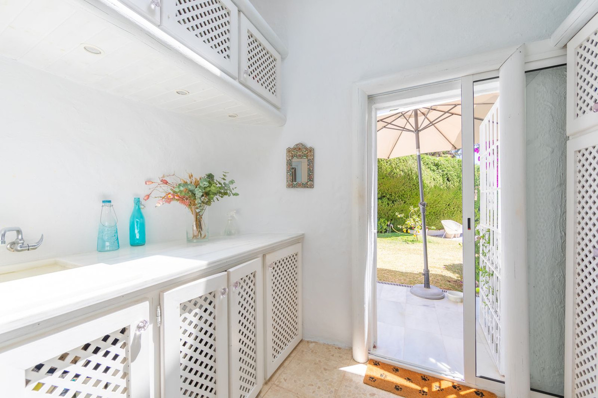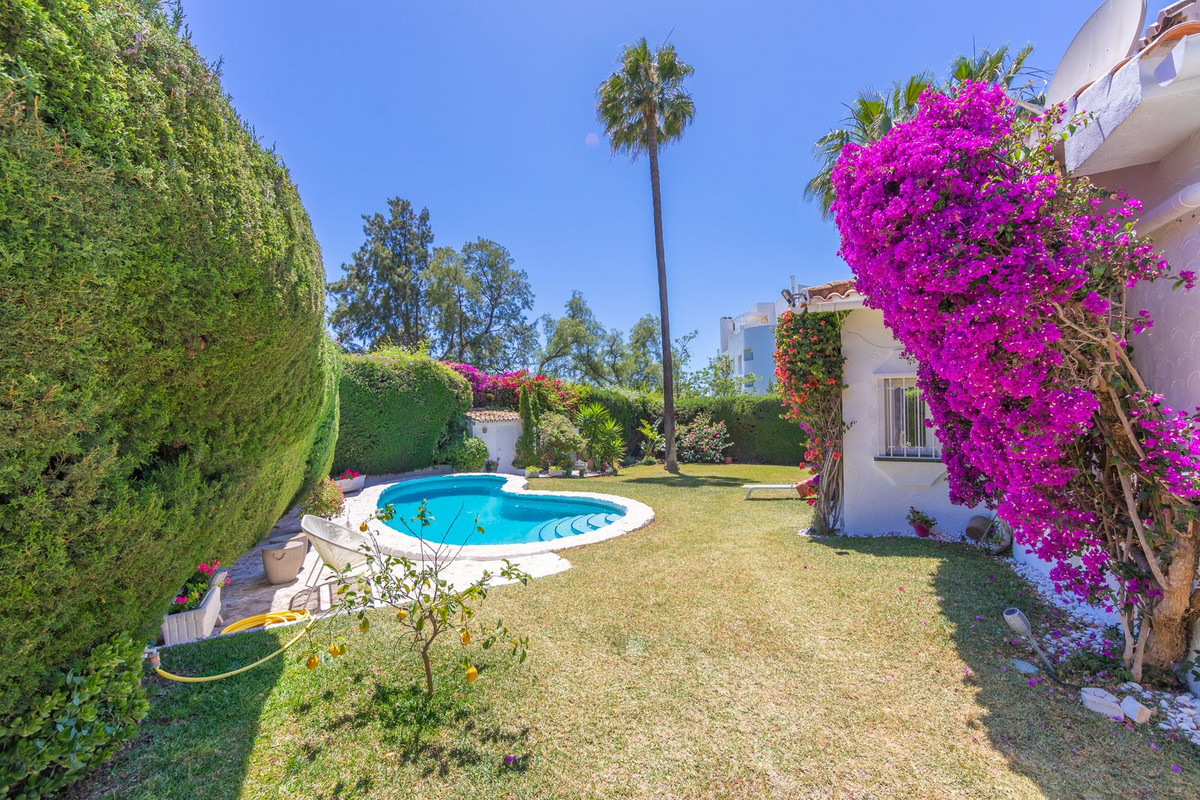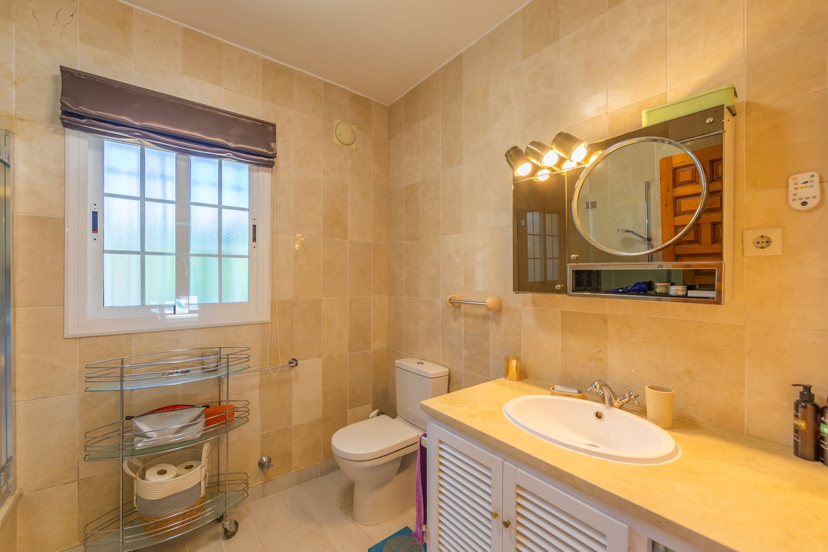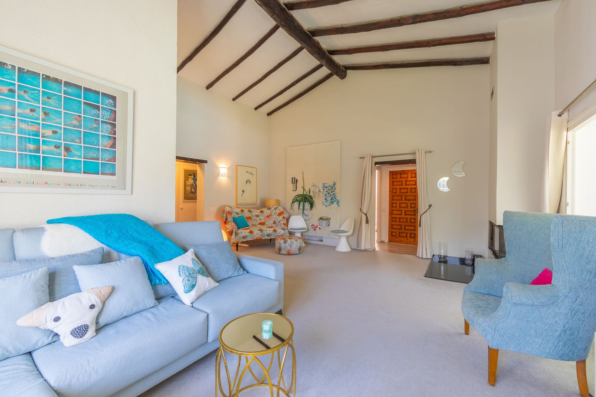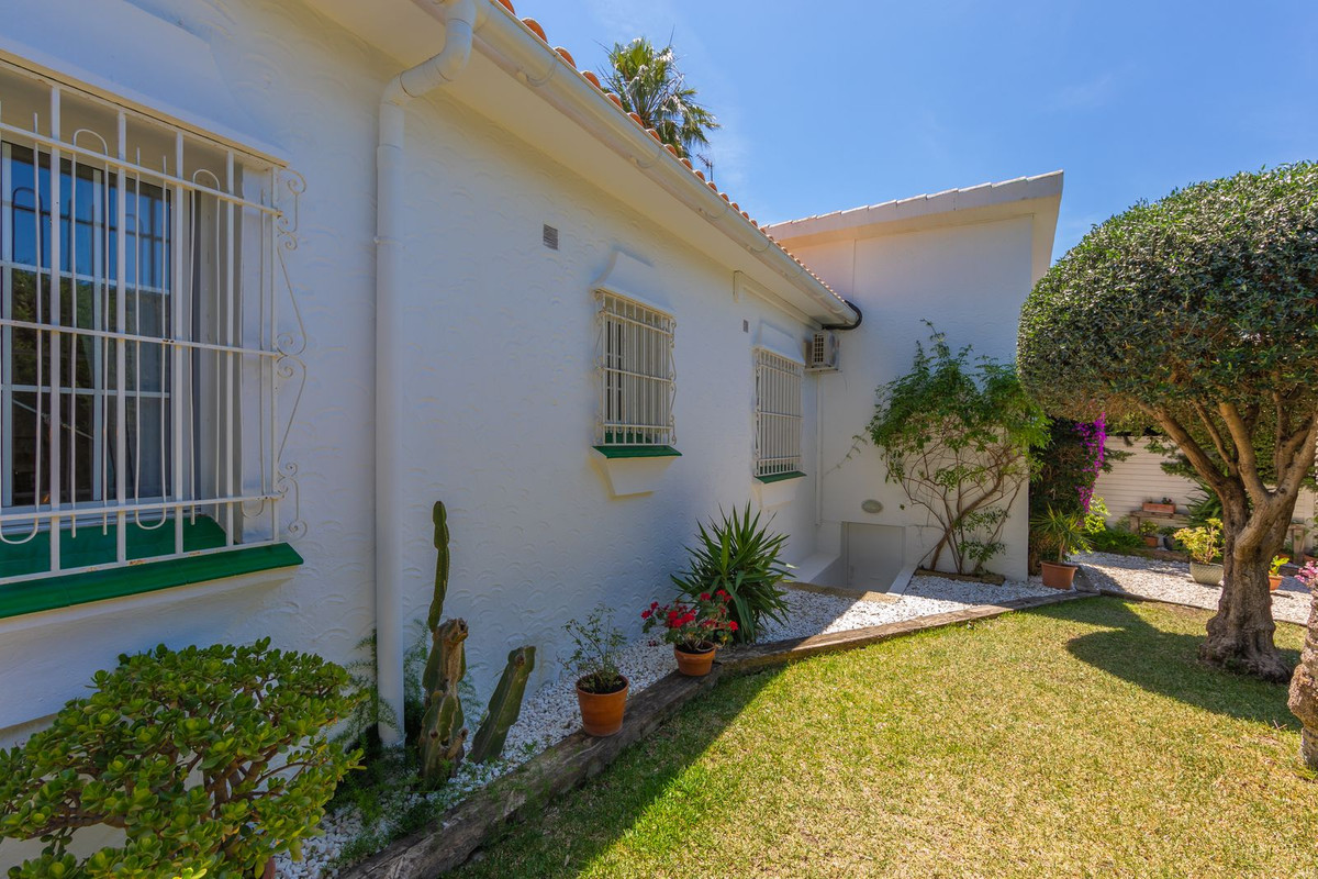 VILLA WITH ATTRACTIVE AND BEAUTIFUL MEDITERRANEAN CHARACTER, DISTRIBUTED ON A COMFORTABLE GROUND FLOOR AND LOCATED ON THE FIRST LINE OF GOLF, OF THE PRETIGIOUS REAL CLUB DE GOLF DE GUADALMINA. Located in a corner, in a cul de sac, located by the 18th Tee of the south . Enjoy a beautiful mature garden, very well maintained, with a multitude of trees and plants. LOCATED, 2 km from San Pedro de Alcántara and 6 km from Puerto Banús. Estepona and Marbella 15 min. Restaurants, Shops, and Leisure Areas just a 10-minute walk away and the beach a 5-minute drive away. Completely surrounded by Golf Courses and just a 3-minute walk from the golf clubhouse. (Golf share optional). Enjoy complete tranquility and privacy. South facing with great light and relaxing views of its excellently maintained mature garden and pool. It has a parking area for 2 cars at the entrance of the house plus a closed garage. In good condition and magnificently built, this property is distributed on a very comfortable single level. With a living room with high ceilings with wooden beams and direct access to the porch, garden and the kidney-shaped pool. The master bedroom en-suite with dressing room and direct access to the garden. A large and very bright kitchen with also high beamed ceilings and a dining area located next to the access to the parking area. The other good size bedrooms share 2 full bathrooms. The home has the option of separating an apartment by a door. From the cozy solarium enjoy relaxing views of the garden, golf courses and mountains. It also features a semi-basement with access from outside the house that could be used as a gym, games room, etc. It has great possibilities to change its distribution. We highly recommend visiting this fantastic property.