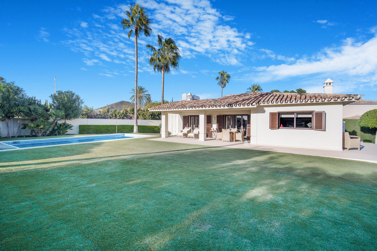 The home sits on a generous flat plot with manicured lawns, palm trees, and a private swimming pool, offering plenty of privacy and space to relax or entertain outdoors. A wide covered terrace extends the living space, perfect for enjoying Marbella’s year-round sunshine.