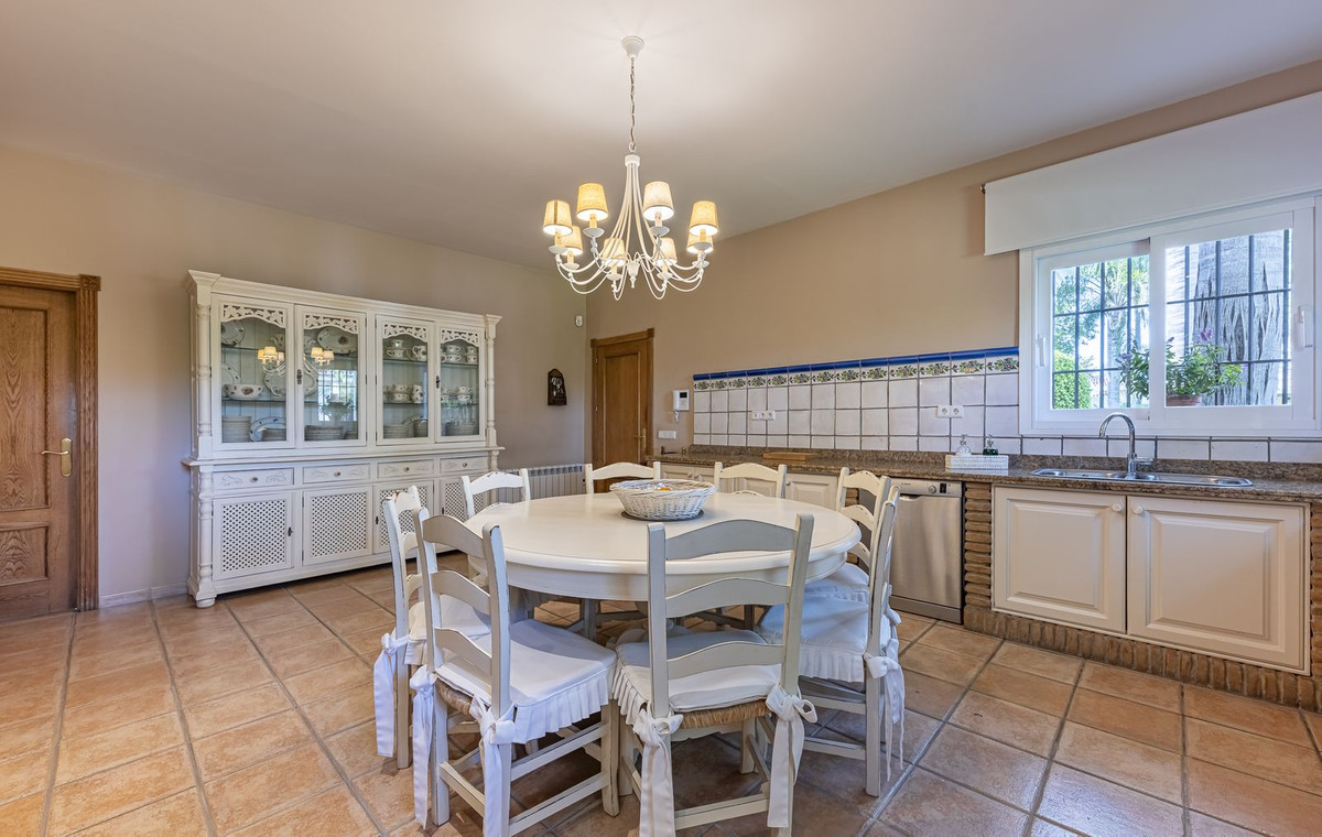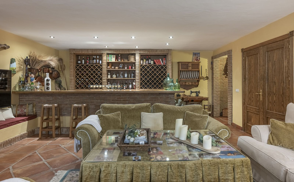 The main entrance leads to a stately hall, where there is a large kitchen with fireplace, pantry, laundry room, several spacious and bright bedrooms, and bathrooms decorated in a refined Andalusian style.