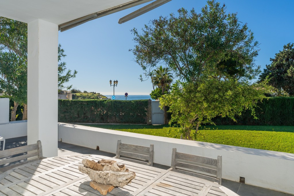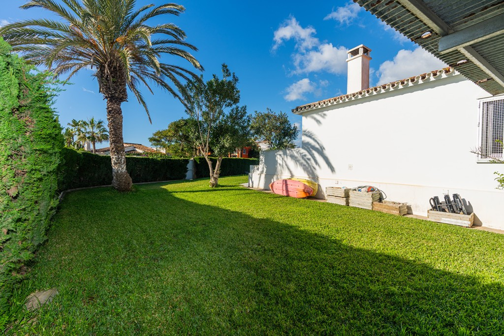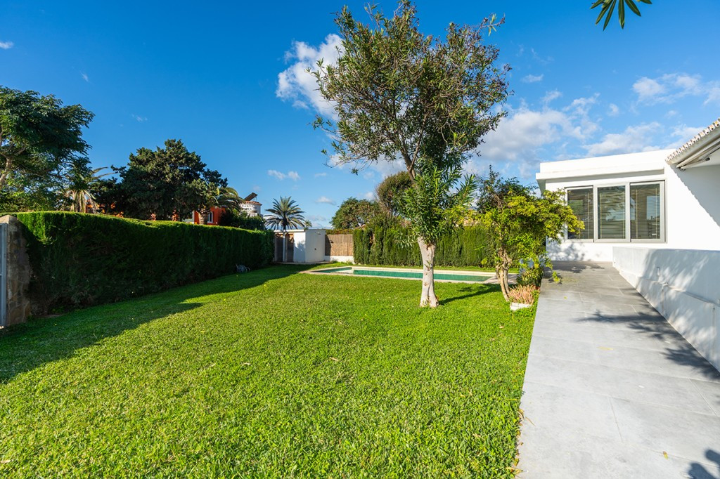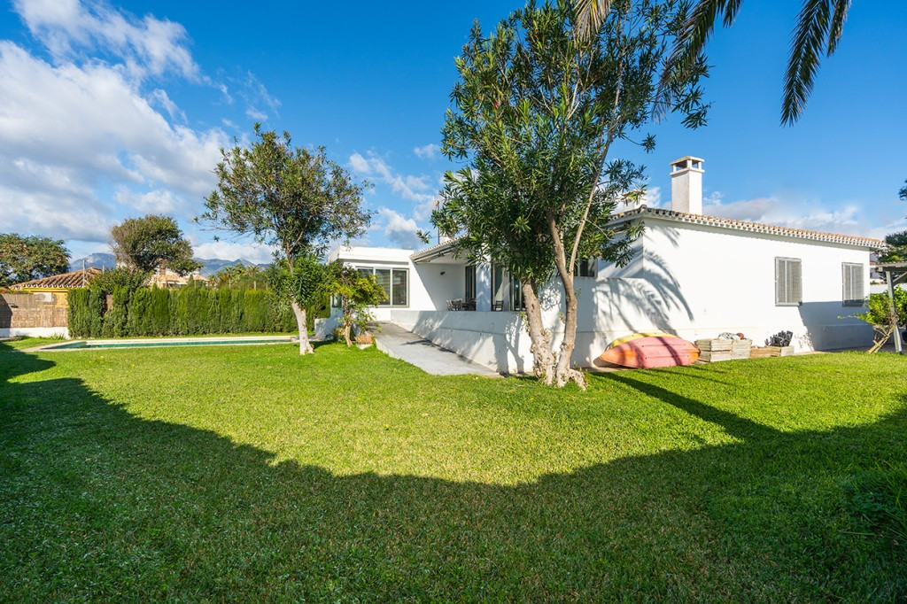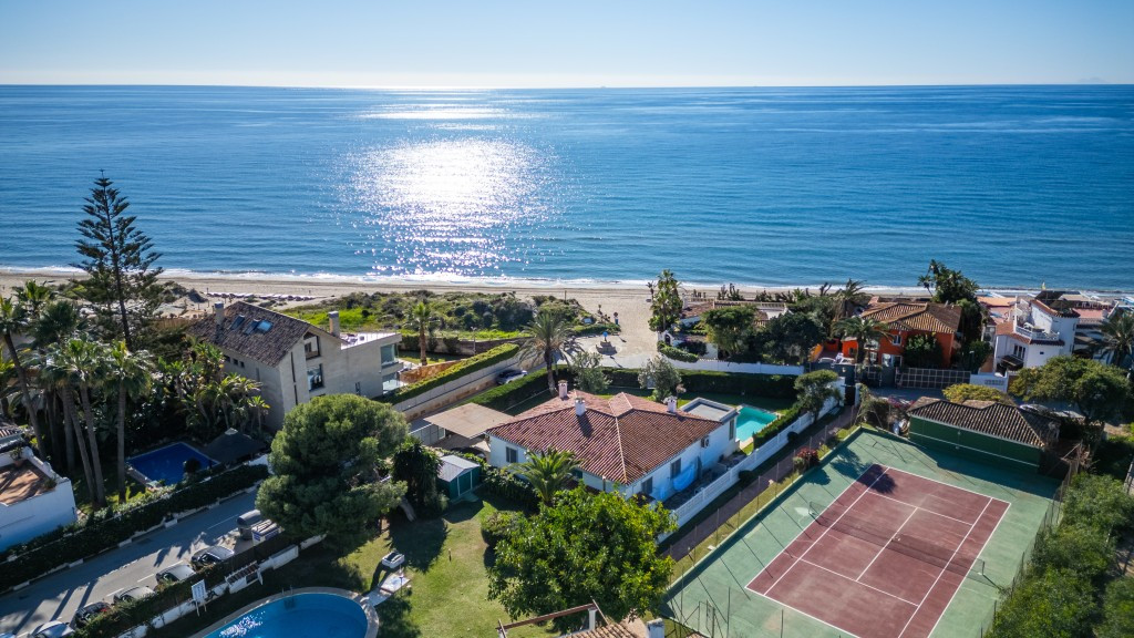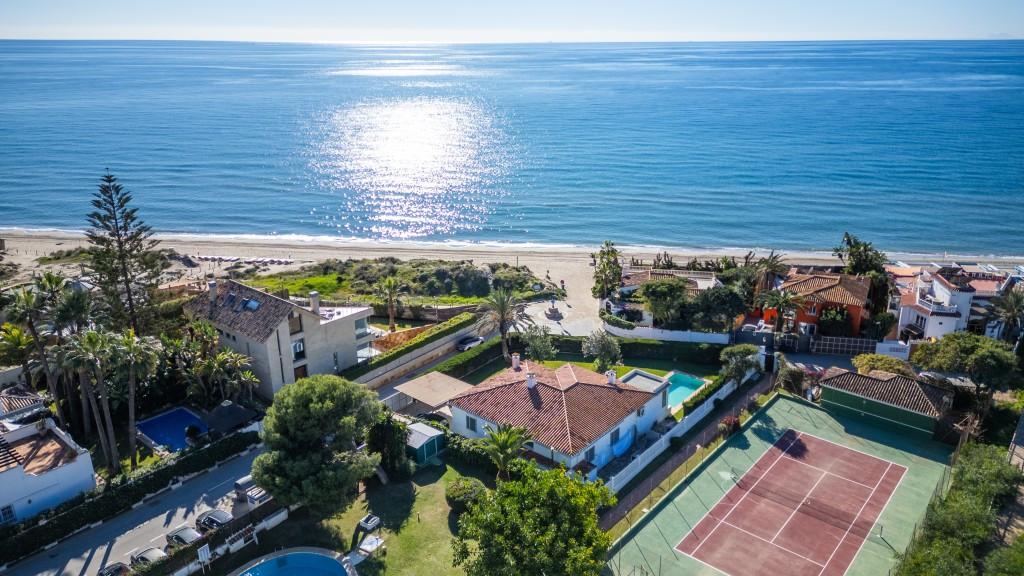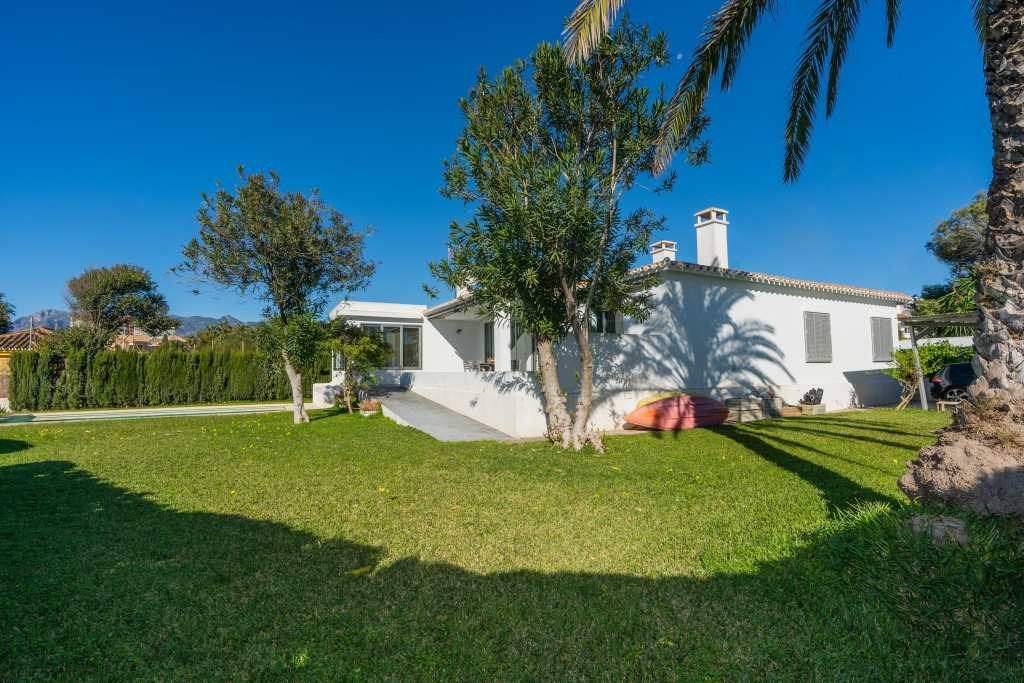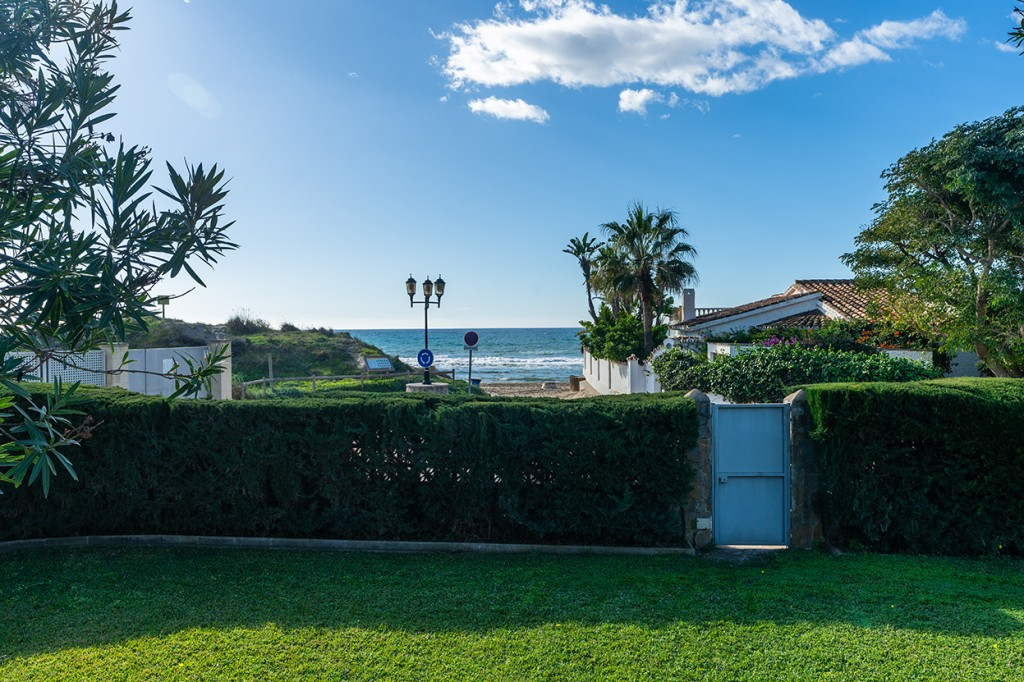 Large villa on one level literally on the the beach in Playas Andaluzas in East Marbella. The house offers a master bedroom with walking closet, office and bathroom, two more bedrooms sharing a bathroom, a modern kitchen open to the dining and living room with access to the beautiful terrace and garden with sea views. Amazing pool with outdoor toilet. Parking area for two cars. In the lower level there is a bedroom used as utility at the moment and a bathroom. Unbeatable location with still potential to increase the house with an upper level.