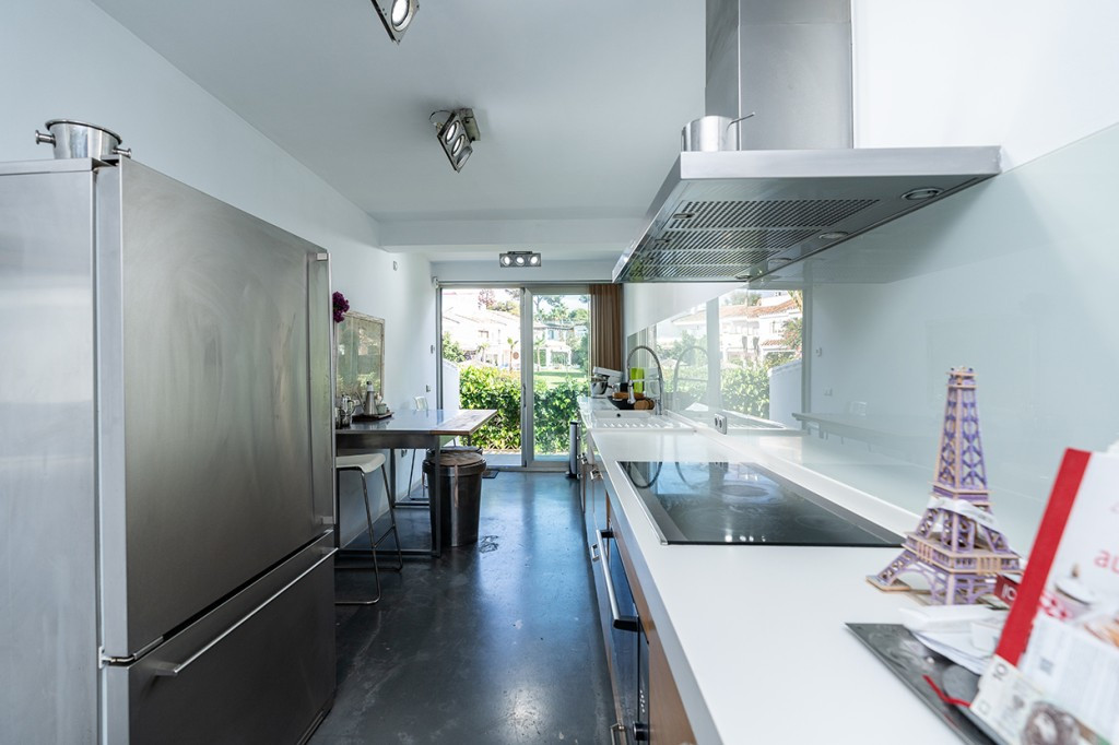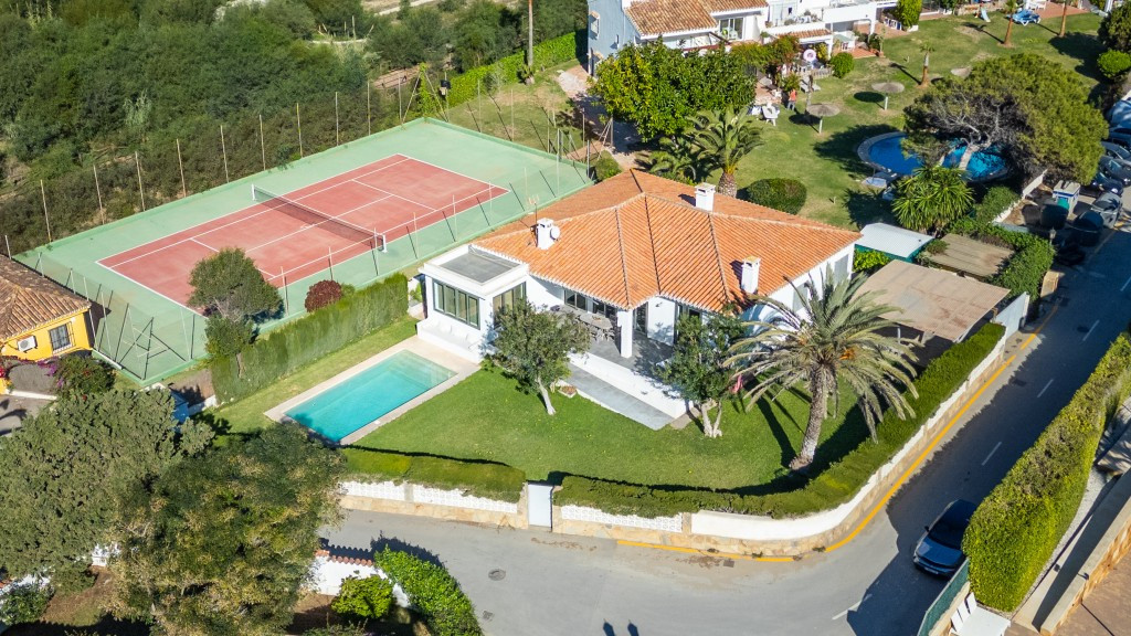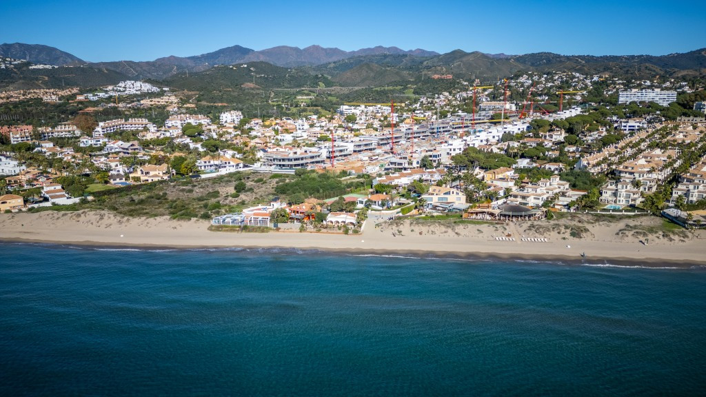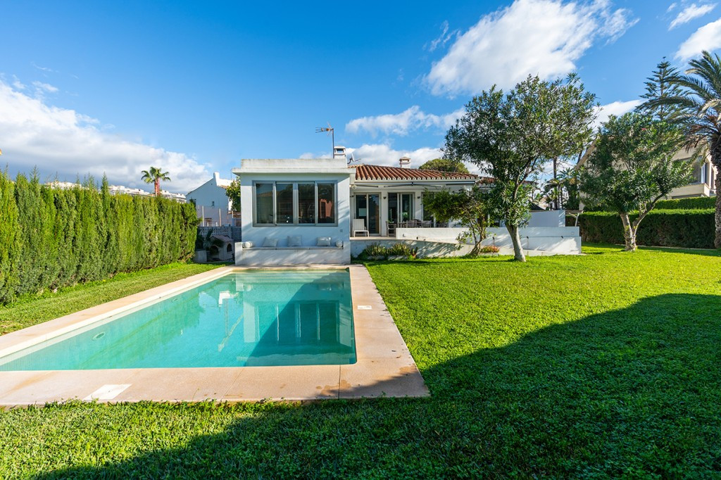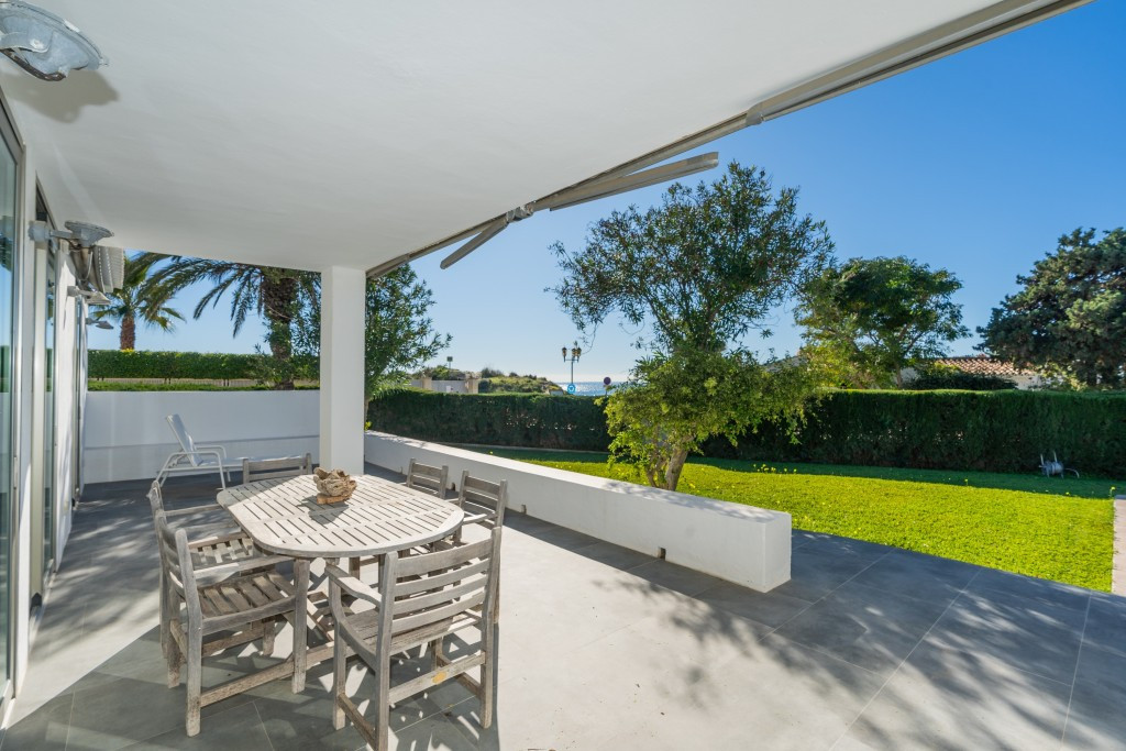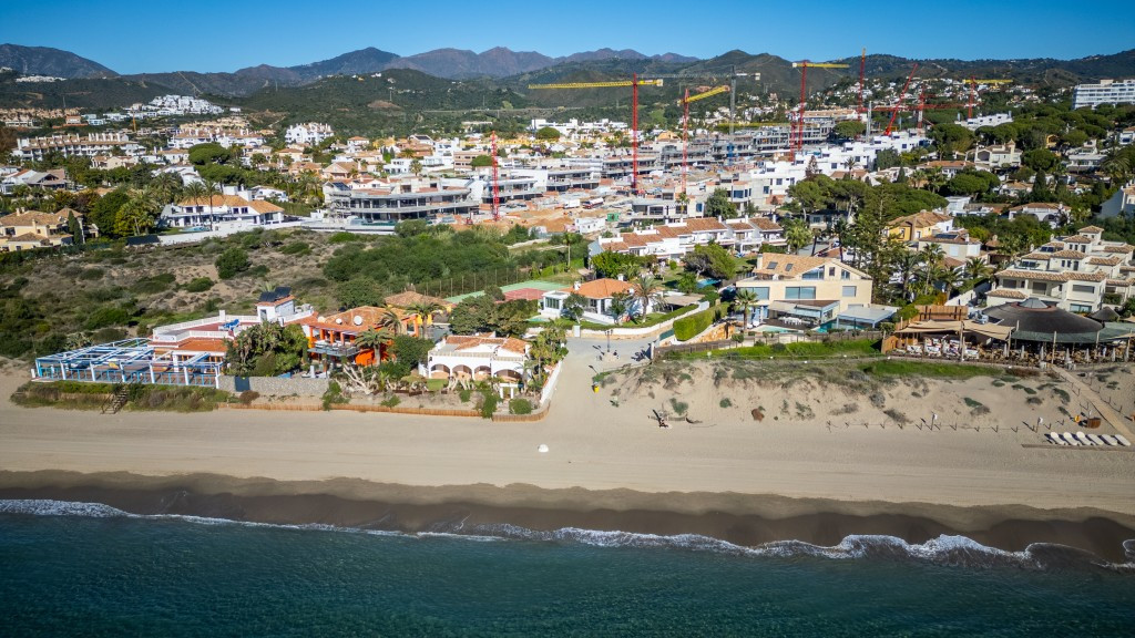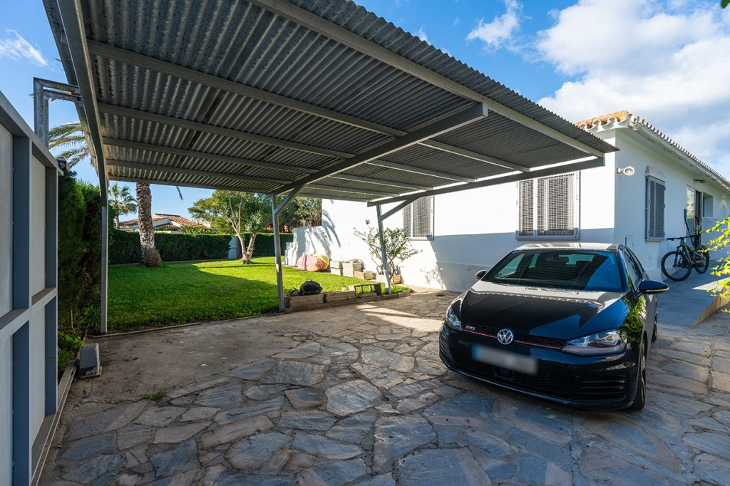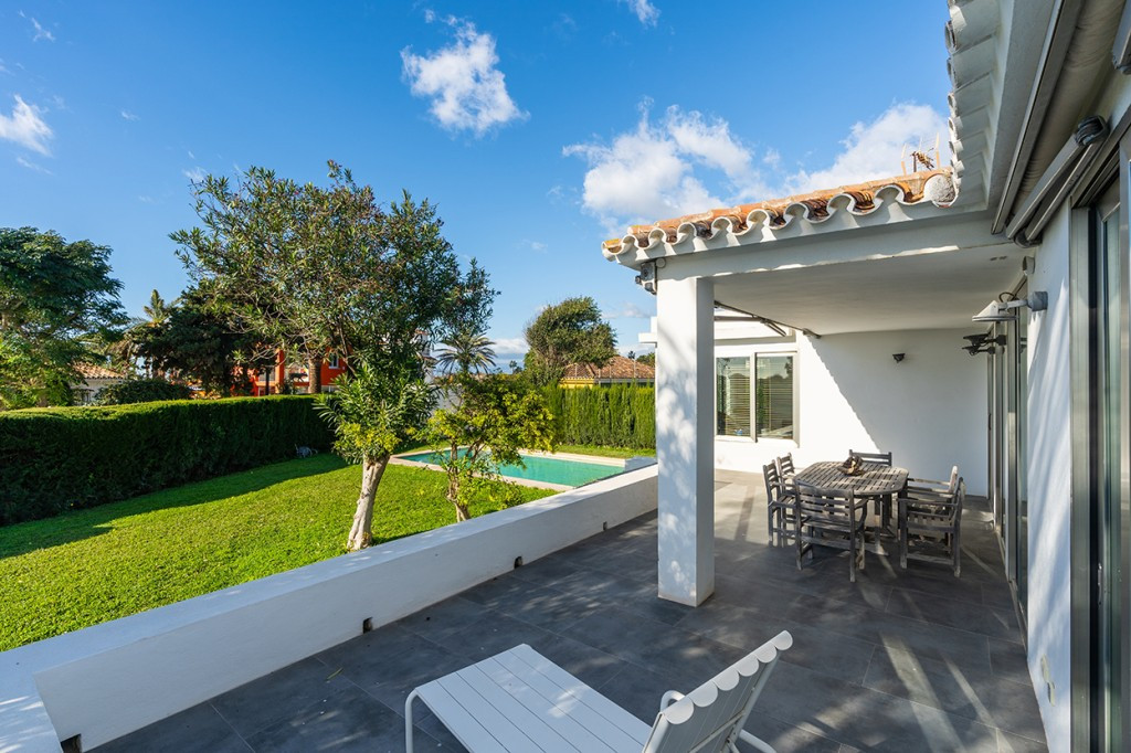 Large villa on one level literally on the the beach in Playas Andaluzas in East Marbella. The house offers a master bedroom with walking closet, office and bathroom, two more bedrooms sharing a bathroom, a modern kitchen open to the dining and living room with access to the beautiful terrace and garden with sea views. Amazing pool with outdoor toilet. Parking area for two cars. In the lower level there is a bedroom used as utility at the moment and a bathroom. Unbeatable location with still potential to increase the house with an upper level.