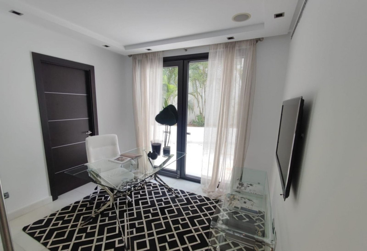 A stunning contemporary five-bedroom villa recently renovated, located just a few minutes’ walk from Central Plaza and Puerto Banús. The entrance and gardens feature a serene Japanese-style water feature, leading into an open-plan foyer with a spacious reception area thoughtfully divided into a TV lounge, dining space, and a double-sided fireplace, with a private office behind a glass partition. The newly renovated kitchen is fully equipped with all modern appliances.