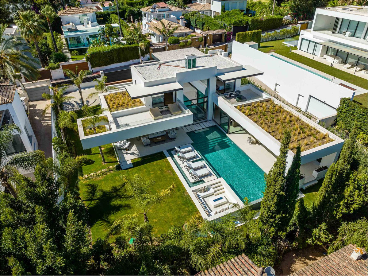 Designed by the acclaimed architect Carlos Lamas, this exceptional villa in Nueva Andalucía redefines luxury living. Situated next to Las Brisas Golf and within walking distance of all amenities, the property offers complete privacy while being in one of the most sought-after locations in Marbella. The grand glass doorway, framed by floor-to-ceiling windows, creates a seamless transition between the lush exterior and the refined interiors. A majestic ancient olive tree stands proudly at the entrance, blending natural beauty with modern sophistication. Spanning across three levels, the villa offers a thoughtfully designed layout that balances style and functionality. •Main Level The master suite is a private retreat, complete with an elegant en-suite bathroom and direct access to the landscaped gardens and heated swimming pool. The impressive living area, with its double-height ceiling, flows seamlessly into the kitchen and dining area, both designed for comfort and entertaining. The covered terrace, equipped with a barbecue and outdoor dining area, provides the perfect setting for al fresco evenings. •First Floor Two spacious en-suite bedrooms, each with private south-facing terraces, offer green views and abundant natural light. •Basement Level A haven for relaxation and entertainment, featuring: Entertainment room with a pool table, wine bodega for collectors and connoisseurs, private gym, sauna, and massage room for ultimate wellness, two spacious en-suite bedrooms, ideal for guests or staff.
