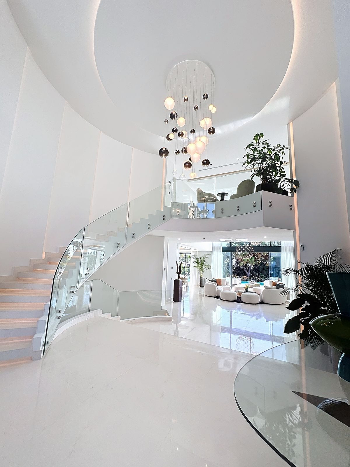 On a 2,633 m² plot, the villa spans 1,320 m² built across 4 levels with elevator, soaring ceilings, floor-to-ceiling windows and a design that maximizes light and the Mediterranean views.