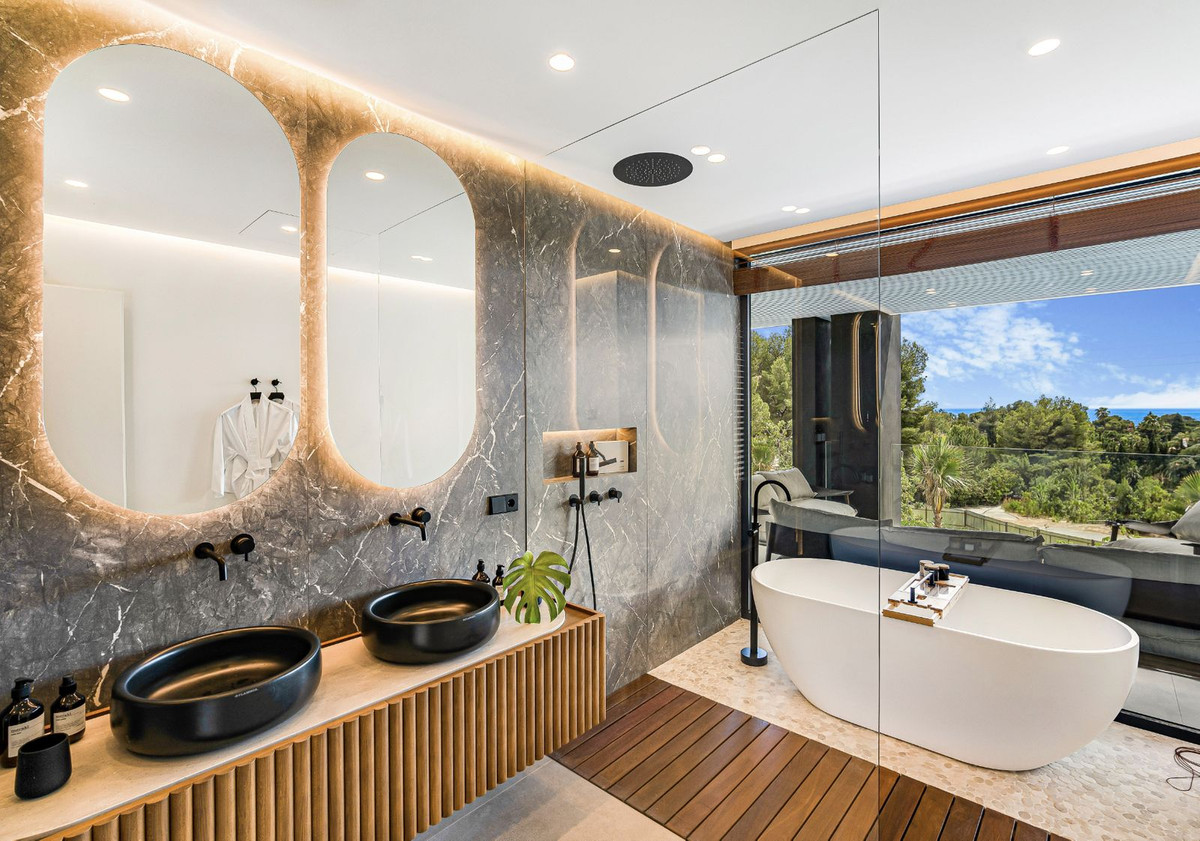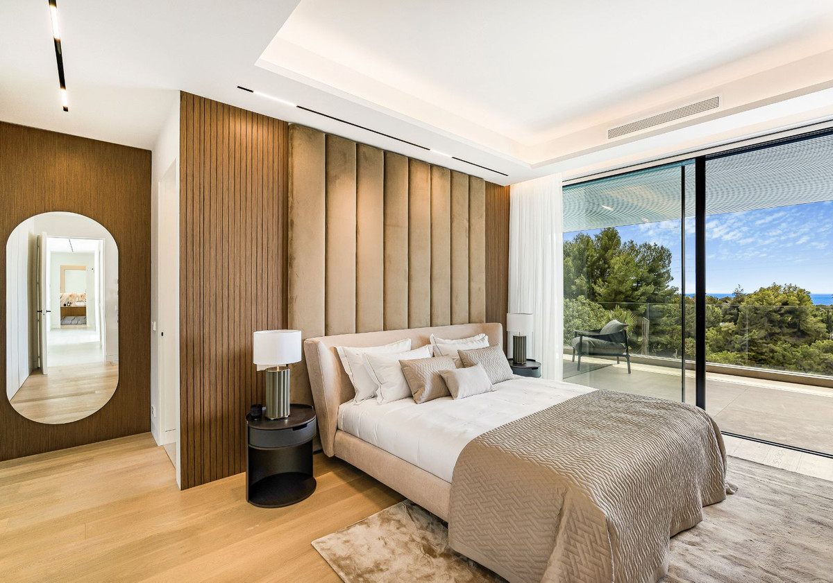Strategically positioned on an elevated site facing south, the villa boasts spectacular views of the Mediterranean Sea and the iconic La Concha mountain, filling the interiors with natural light throughout the day.