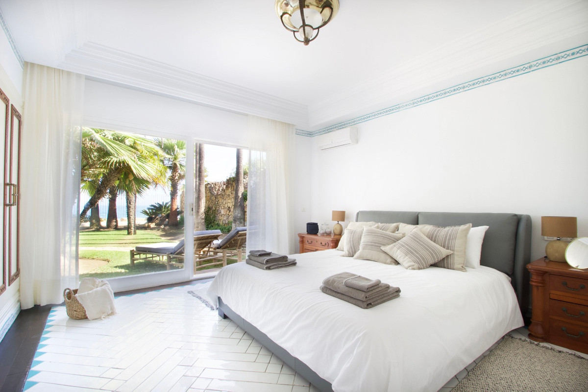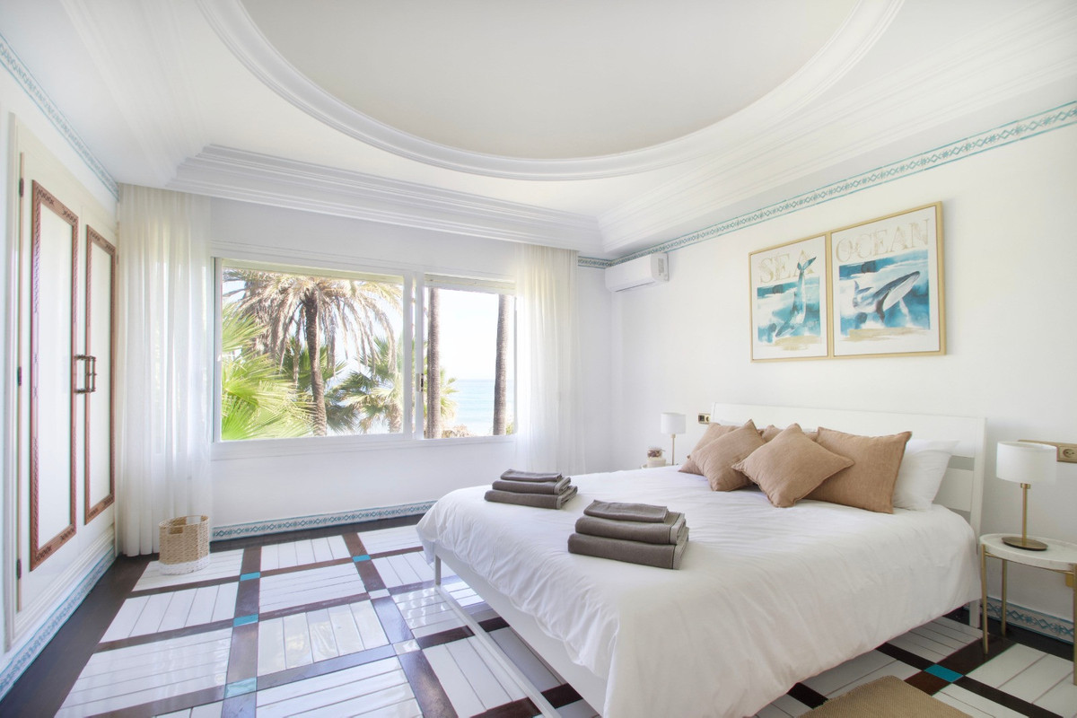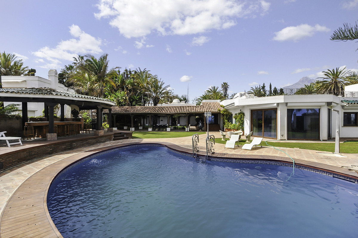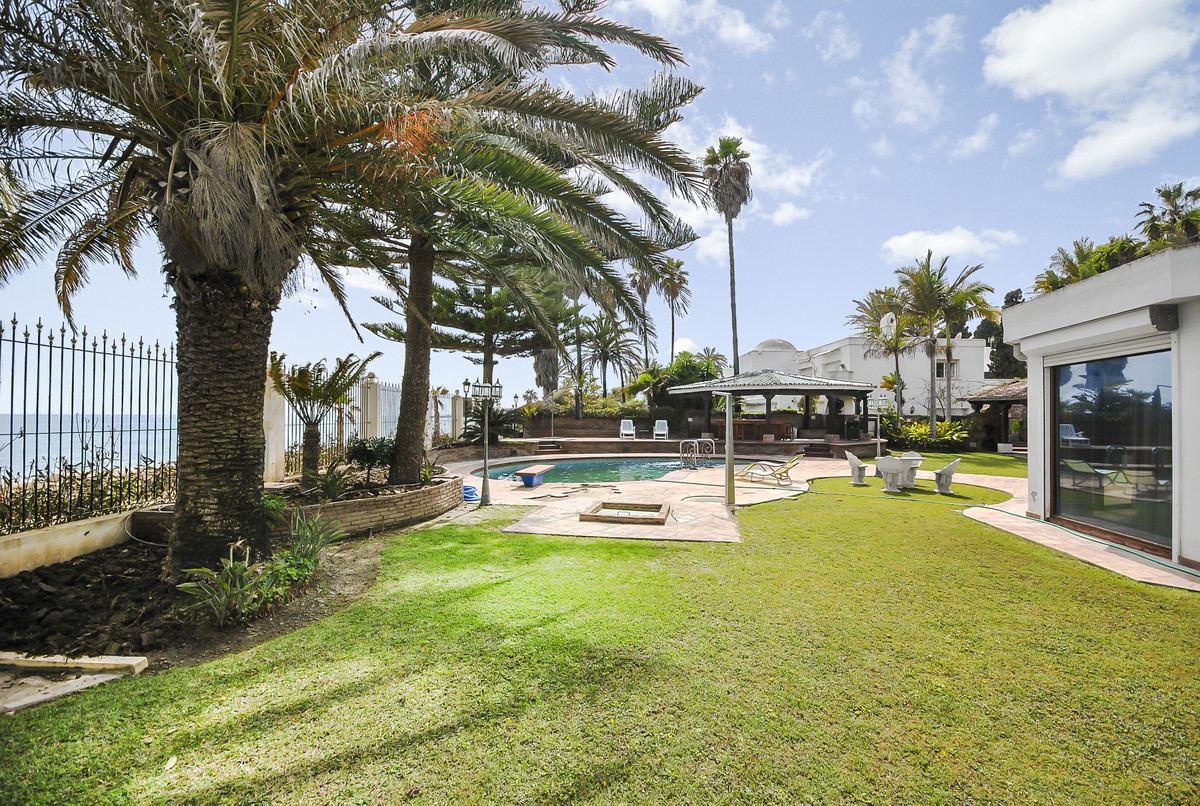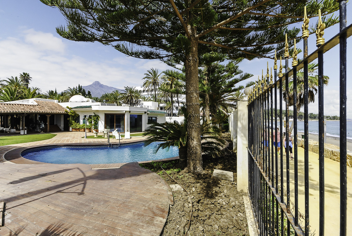A very spacious & unique villa situated in an unrivalled front line beach position in one of Spain's most privileged location, Marbella's exclusive Golden Mile. The villa is set on a double plot and offers on the ground level an entry hall, a guest toilet, office, spacious living room leading onto the garden with various terraces, swimming pool, bar, and direct access to the promenade. On this floor there is a separate dining room with vaulted skylight ceiling, a fully equipped kitchen with separate entrance, the master suite with walking wardrobes, 2 further double en suite bedrooms, and 2 bedrooms sharing a bathrooms. On this level there are two self contained guest apartments with 2 bedroom suites and living area, as well as a garage for four cars. These apartments are accessed separately form the main house. On this level we will also find a separate area with cinema room, an industrial kitchen with storeroom and 2 toilets.