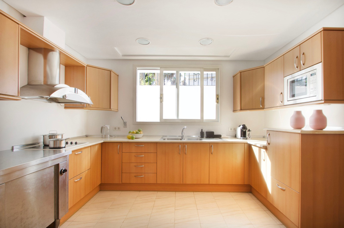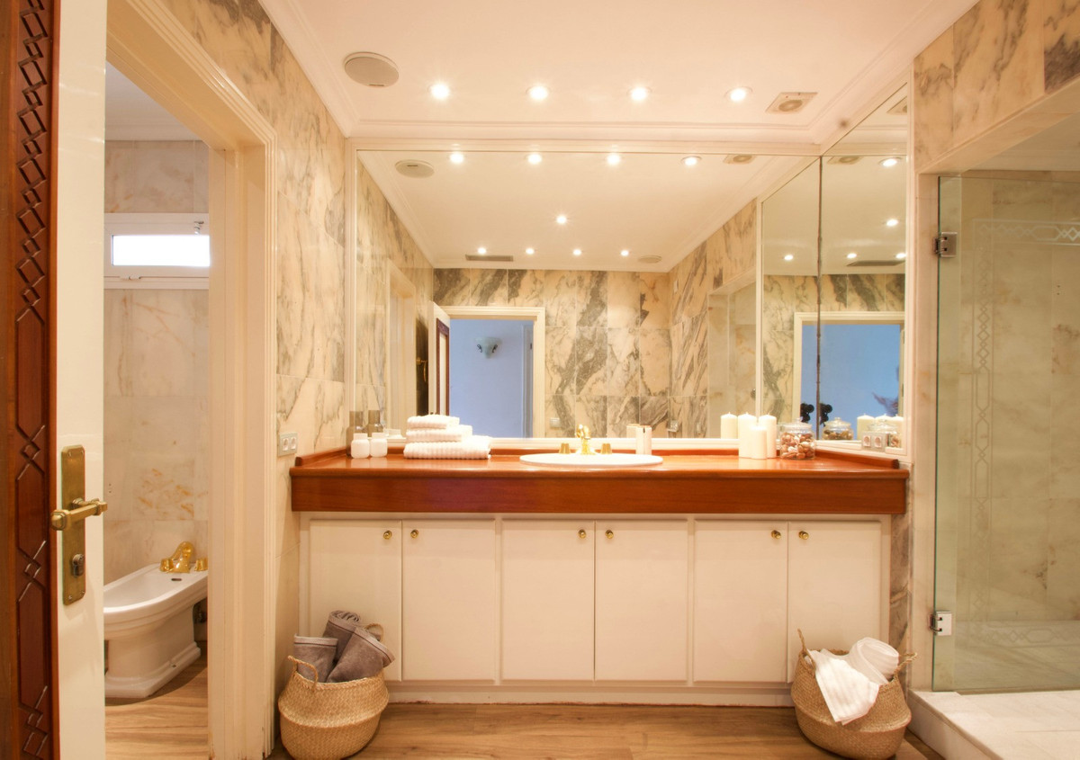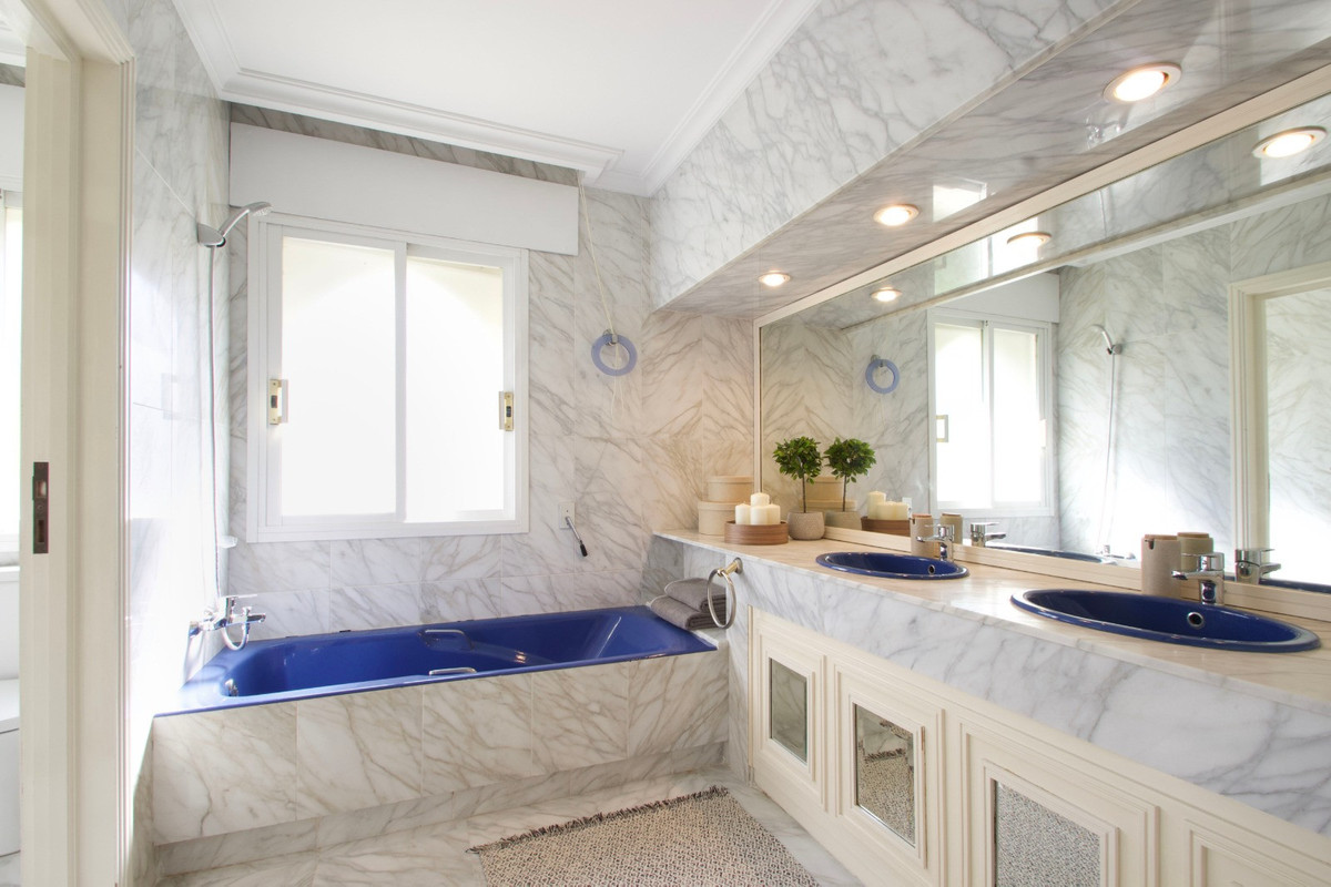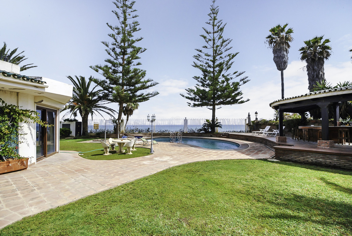A very spacious & unique villa situated in an unrivalled front line beach position in one of Spain's most privileged location, Marbella's exclusive Golden Mile. The villa is set on a double plot and offers on the ground level an entry hall, a guest toilet, office, spacious living room leading onto the garden with various terraces, swimming pool, bar, and direct access to the promenade. On this floor there is a separate dining room with vaulted skylight ceiling, a fully equipped kitchen with separate entrance, the master suite with walking wardrobes, 2 further double en suite bedrooms, and 2 bedrooms sharing a bathrooms. On this level there are two self contained guest apartments with 2 bedroom suites and living area, as well as a garage for four cars. These apartments are accessed separately form the main house. On this level we will also find a separate area with cinema room, an industrial kitchen with storeroom and 2 toilets.