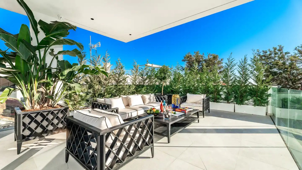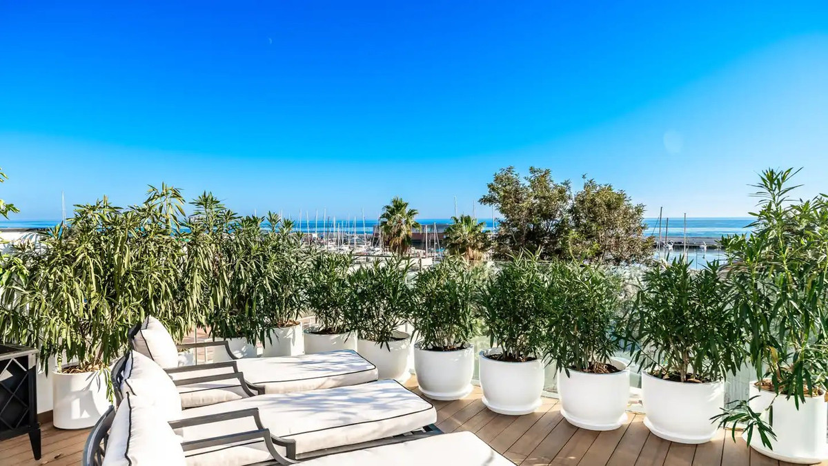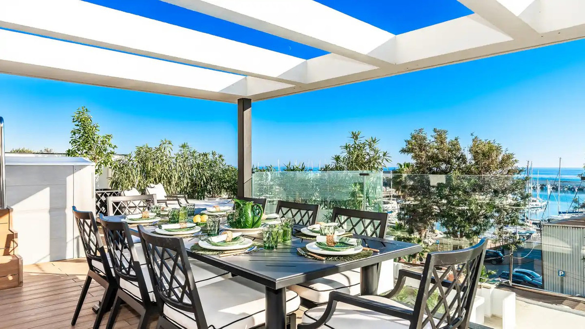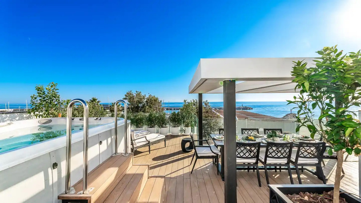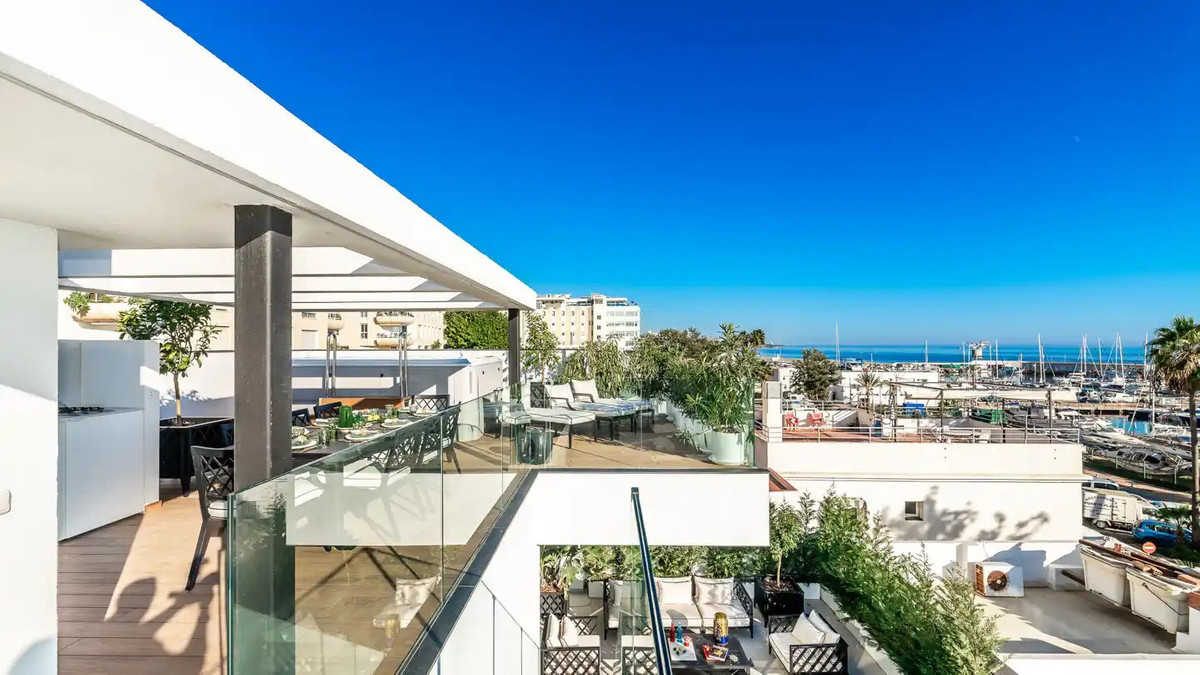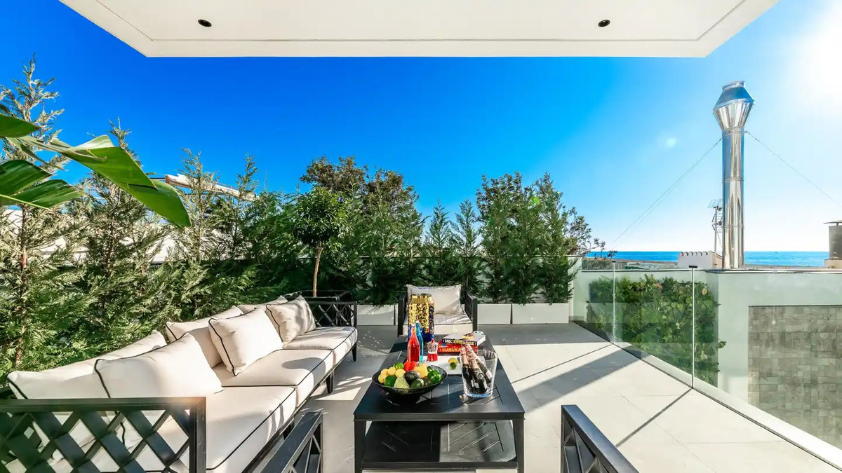 A fantastic south-facing terrace on this level offers breathtaking views of the Mediterranean Sea and Marbella’s bustling promenade. Ascending to the top floor, an impressive solarium awaits, providing panoramic views of both the sea and the surrounding mountains. This outdoor sanctuary is perfect for embracing the Mediterranean lifestyle, with a summer kitchen, a comfortable seating area, a jacuzzi, and ample space for al fresco dining.
