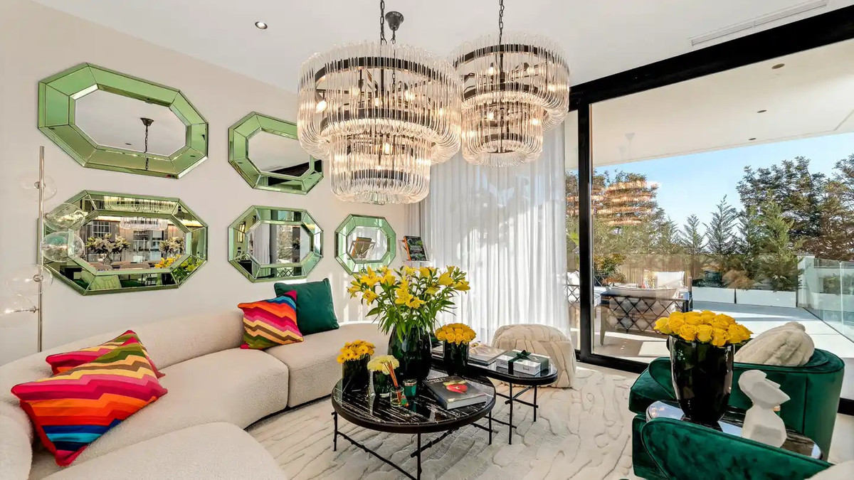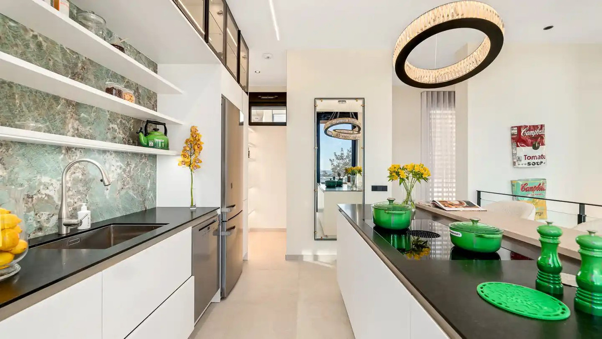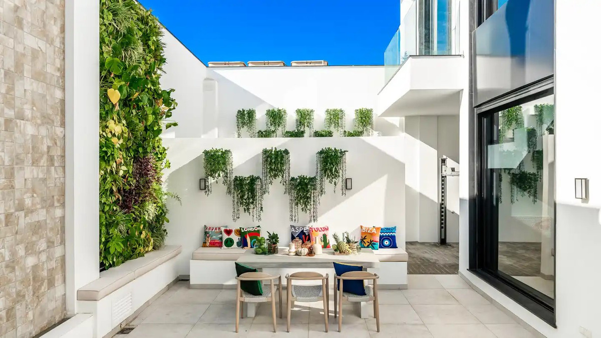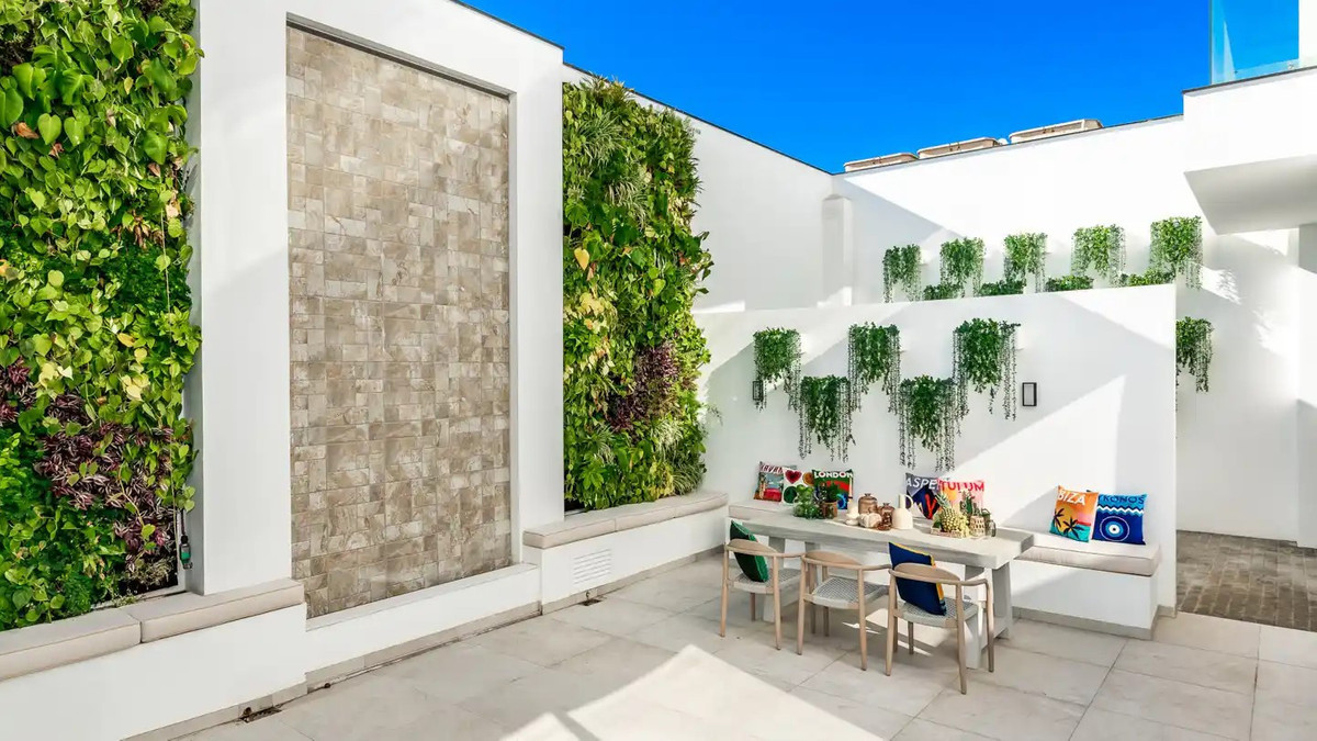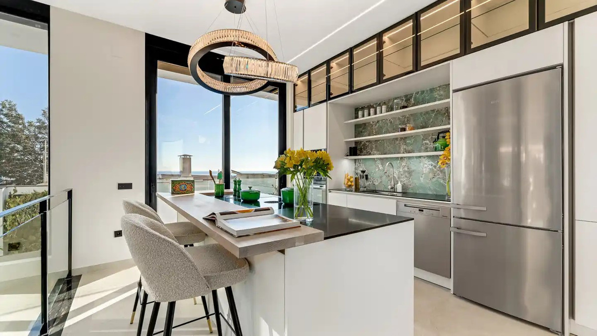 The main floor welcomes you with a grand entrance hall and features three spacious en-suite bedrooms, all elegantly designed. This floor also opens onto a chic chill-out terrace, featuring a calming waterfall and a lush vertical garden, creating a serene outdoor space. Floor-to-ceiling glass windows flood the interior with natural light, offering a seamless connection to the terrace. A stylish staircase leads to the second floor, where you’ll find an open-plan living space, designed for both relaxation and entertaining. The fully equipped kitchen boasts stunning sea views, a cosy coffee corner for informal moments, and a guest cloakroom.