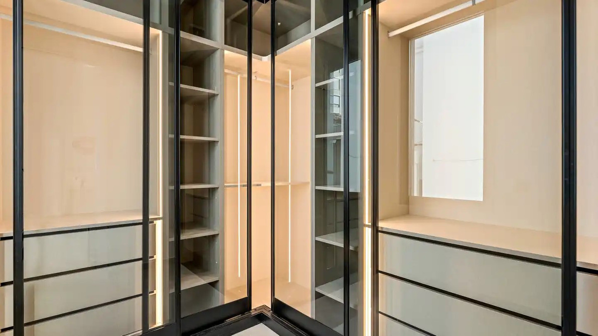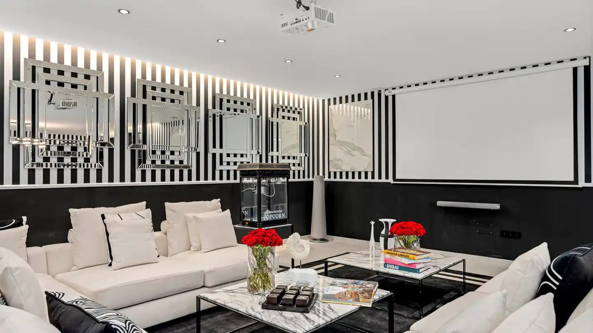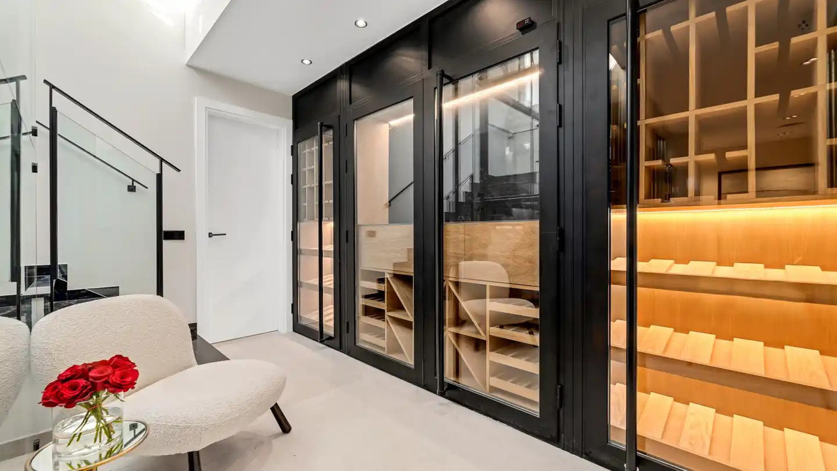 On the lower level, an exceptional entertainment area awaits. It includes a private wine cellar and a luxurious lounge where guests can enjoy a game of billiards or experience immersive cinema nights with high-end audiovisual equipment. For added fun, a popcorn machine is included, perfect for creating a true home cinema experience. This floor also houses two guest bedrooms, a guest toilet, a fully equipped laundry room with Miele appliances, and the machinery room.