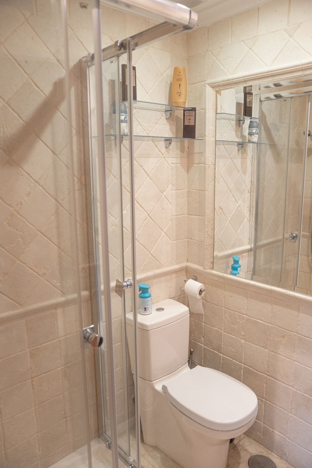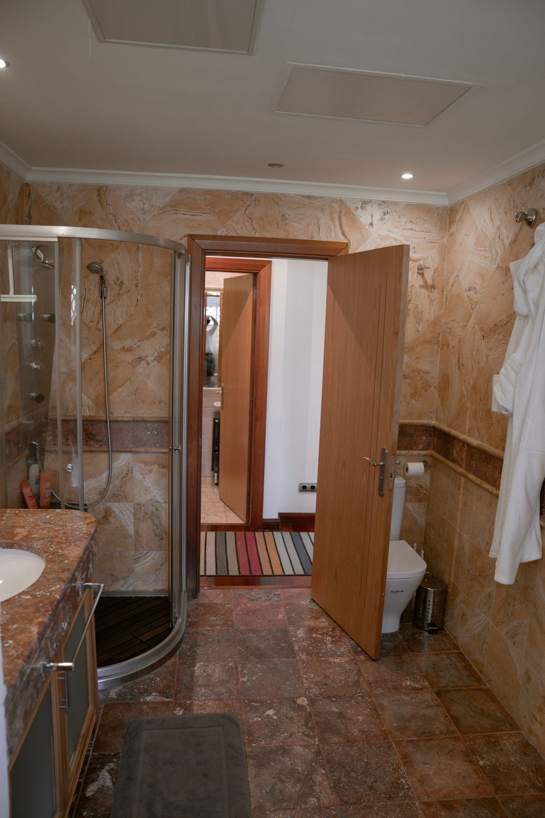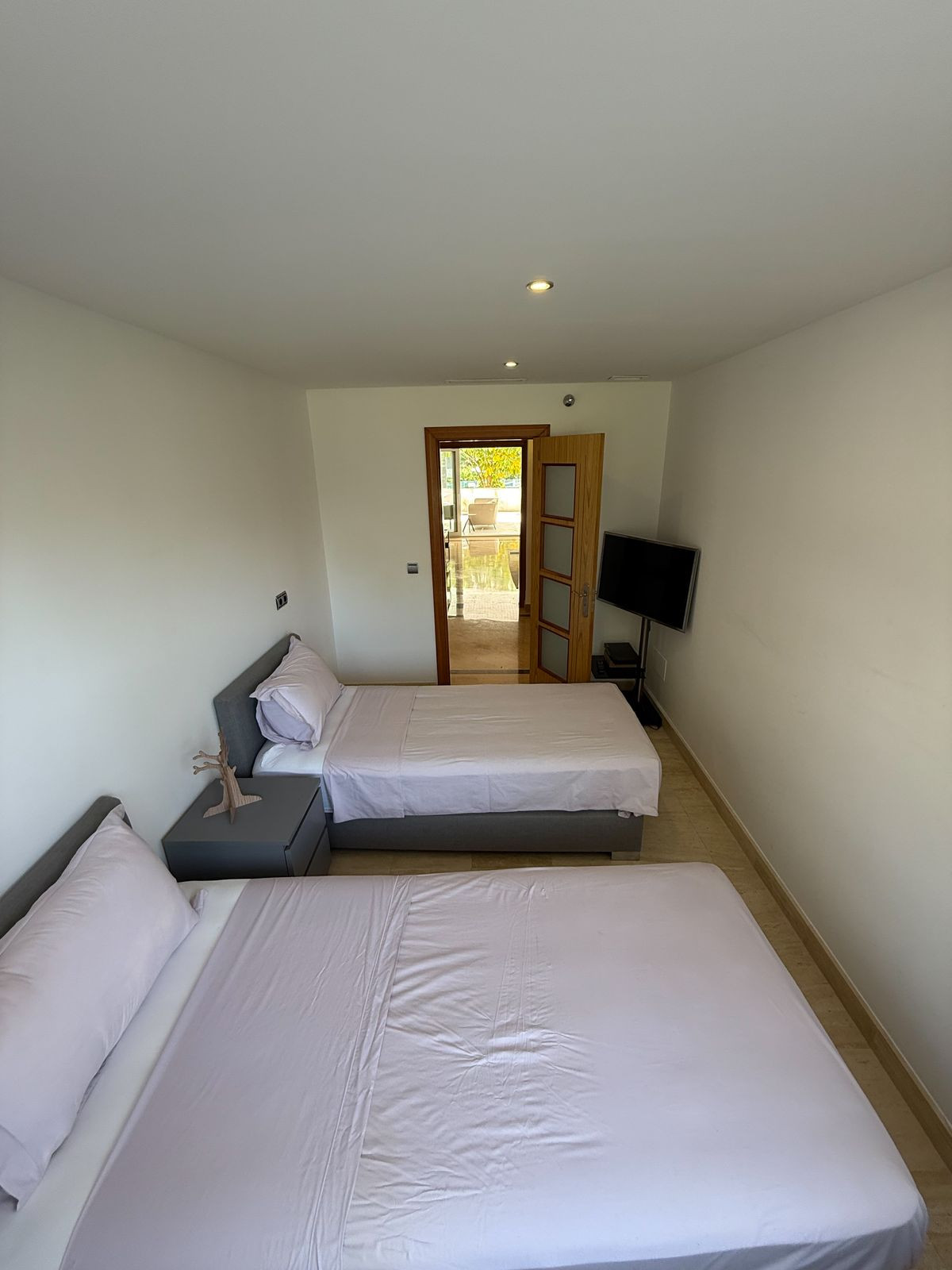 The modern kitchen is fully equipped with high-end appliances. The property offers three bedrooms and three bathrooms. The master bedroom has an en-suite bathroom with a bathtub and shower and direct access to the terrace.