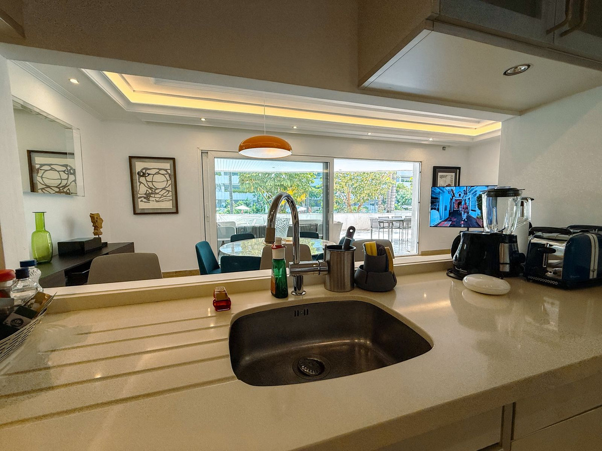 Elegant ground-floor apartment with 157 m² built, located in the prestigious Embrujo de Banús complex, just a 3-minute walk from the beach: Ocean Club, Mistral Beach, etc. Spacious living/dining room with direct access to the terrace of over 70 m².