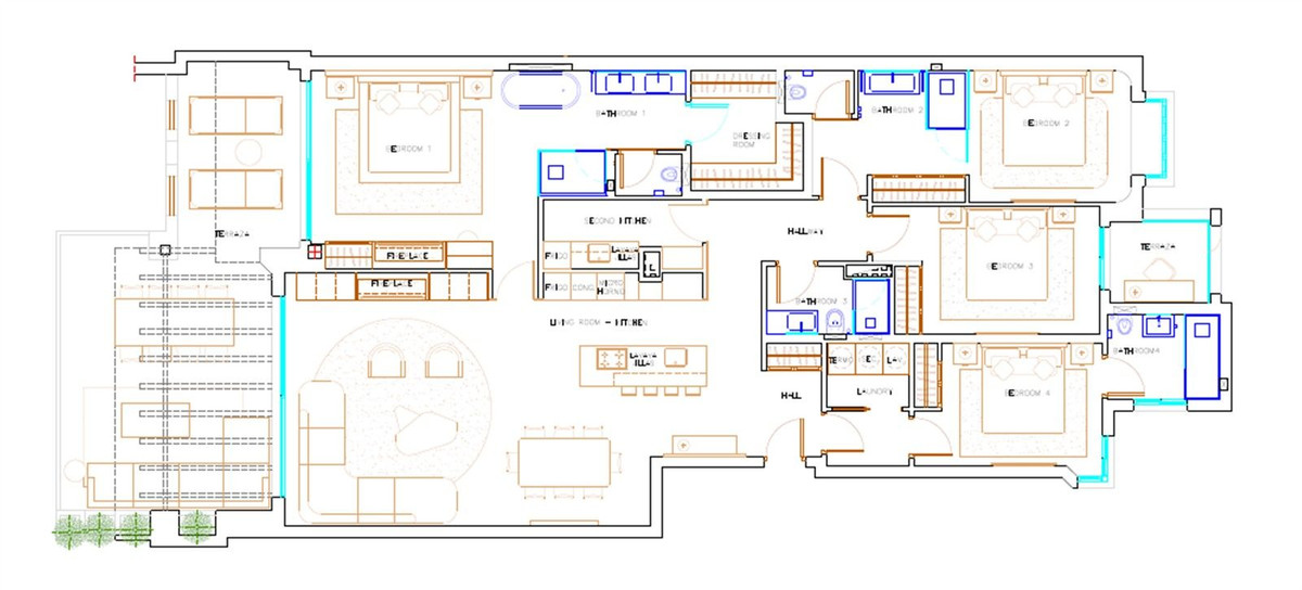 Spanning a generous 218 m² (187 m² interior + 49 m² terrace), the apartment features a spacious open-concept layout, perfect for modern living and entertaining. Three of the four bedrooms include en-suite bathrooms, offering privacy and comfort for family and guests alike. The property is sold fully furnished with high-end contemporary décor and includes a fully equipped open-plan kitchen, a separate kitchenette, and a dedicated laundry room.