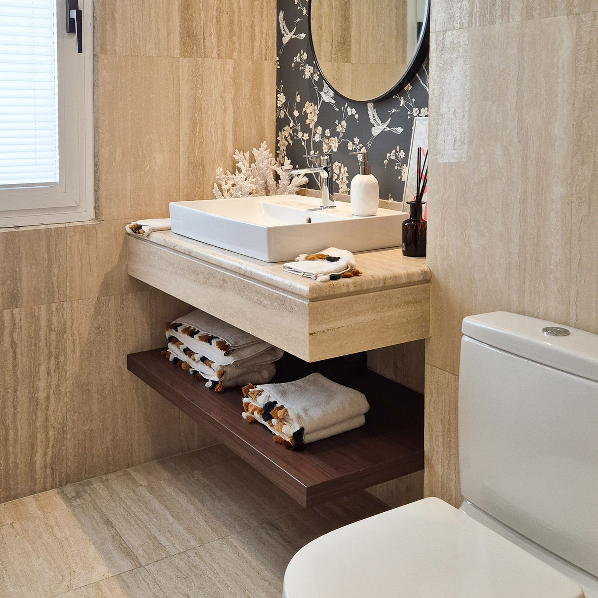 The first floor is distributed into an entrance hall that leads to the living room, kitchen, and dining room, all of which share a large terrace, a guest toilet, and a bedroom with an en-suite bathroom. A modern staircase takes us to the second floor, where there is another bedroom, a full bathroom, a wardrobe area, and a large master bedroom with a dressing area and a full bathroom, all with access to the large terrace with views.