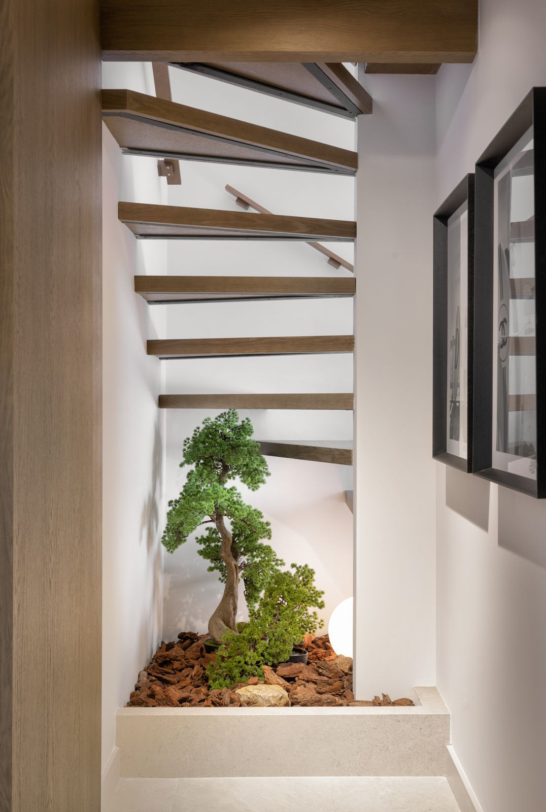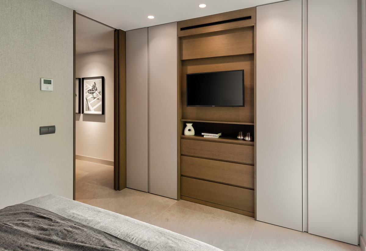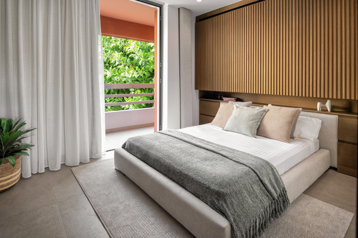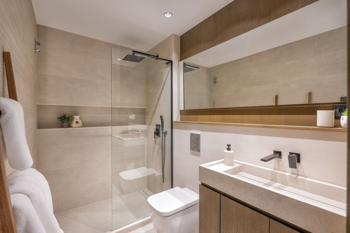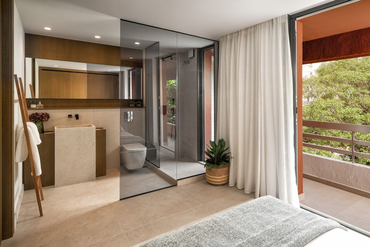 Upon entering the apartment, you are welcomed by a stunning island kitchen that sets the scene for the rest of the space as it blends harmoniously into the living area and further into the terrace, giving the impression that it is a part of the living room. Enjoy the peaceful views of the green gardens from your kitchen, where sunlight pours in to fill every square inch. The choice of materials and color palette infuses this area with a sense of peace, comfort, and subtle elegance.