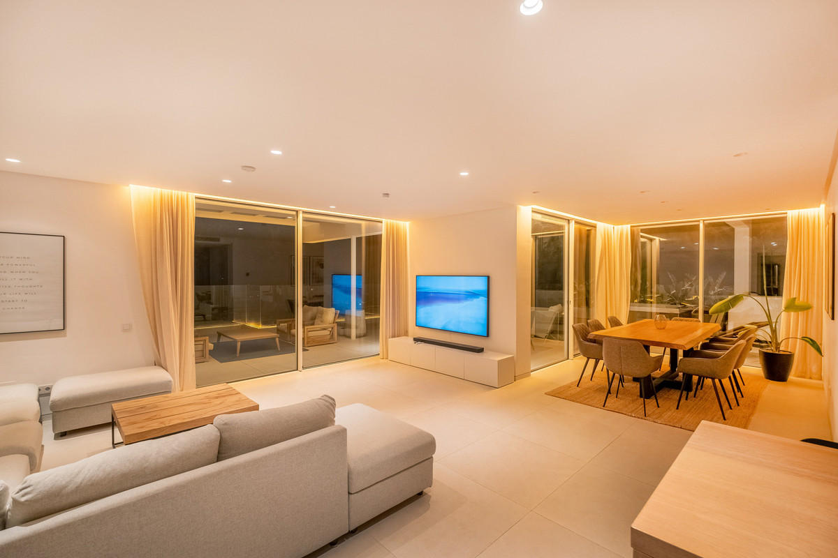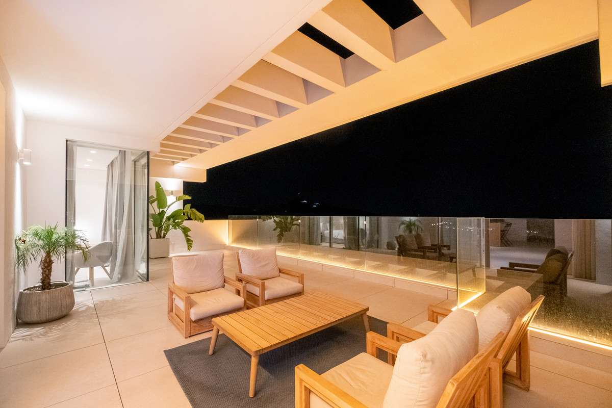 Welcome to one of the most luxurious duplex penthouses currently on the market in the prestigious gated resort-like community - Palo Alto. This penthouse has a spacious and beautiful interior together with huge terrace spaces offering fantastic panoramic views of the Mediterranean sea and mountain views with the sun light throughout the whole day. The home has been developed up to the highest standards and completed in 2020. This penthouse offers an open plan living room connecting the kitchen and dinning area together. The kitchen is designed by Gunni & Trentino with Siemens appliances and has direct and convenient access to the separate laundry area. Going out to the the terrace, you are immediately amazed by one of the best sea and mountain views you can possibly find in Marbella. Each corner offers a private seating area with its own privacy as well. The main terrace has a jacuzzi, lounge area and staircase leading to the rooftop terrace. Once you are on the rooftop terrace, you feel like in a private villa. Over 100m2 extra space has a heated pool, sun beds and lounge sofa to experience a complete serenity and the feeling of absolute luxury. The penthouse has 3 bedrooms, 2 bathrooms and 1 guest toilet room. The master bedroom with ensuite bathroom has a direct access to the terrace and a kingsize bed facing the sunset views. The second bedroom is on the opposite side of the property which also has a direct access to the terrace greeted by the morning sun. The third bedroom is a very generous size with two single beds. Both bedrooms share a bathroom with a bathtub and a toilet. All areas in this wonderful penthouse have a central air-con system with heating and cooling functions which can be controlled individually in every room. The underground secured parking garage for 2 cars and a storage room is included in the price. The parking garage has an elevator access that goes to the top floor and to the entrance of the penthouse. The furniture package is 50.000 Euros.