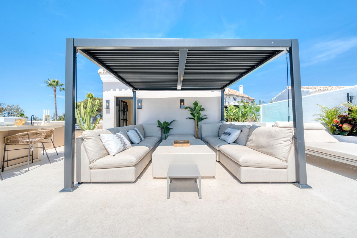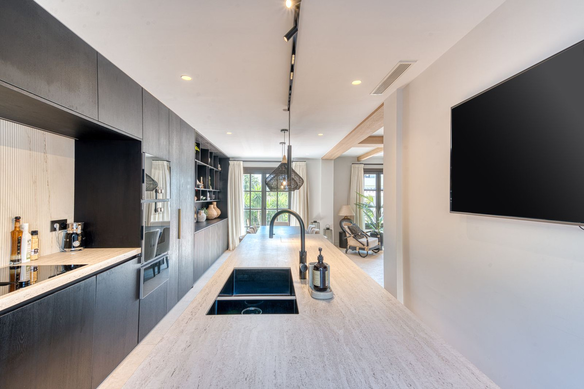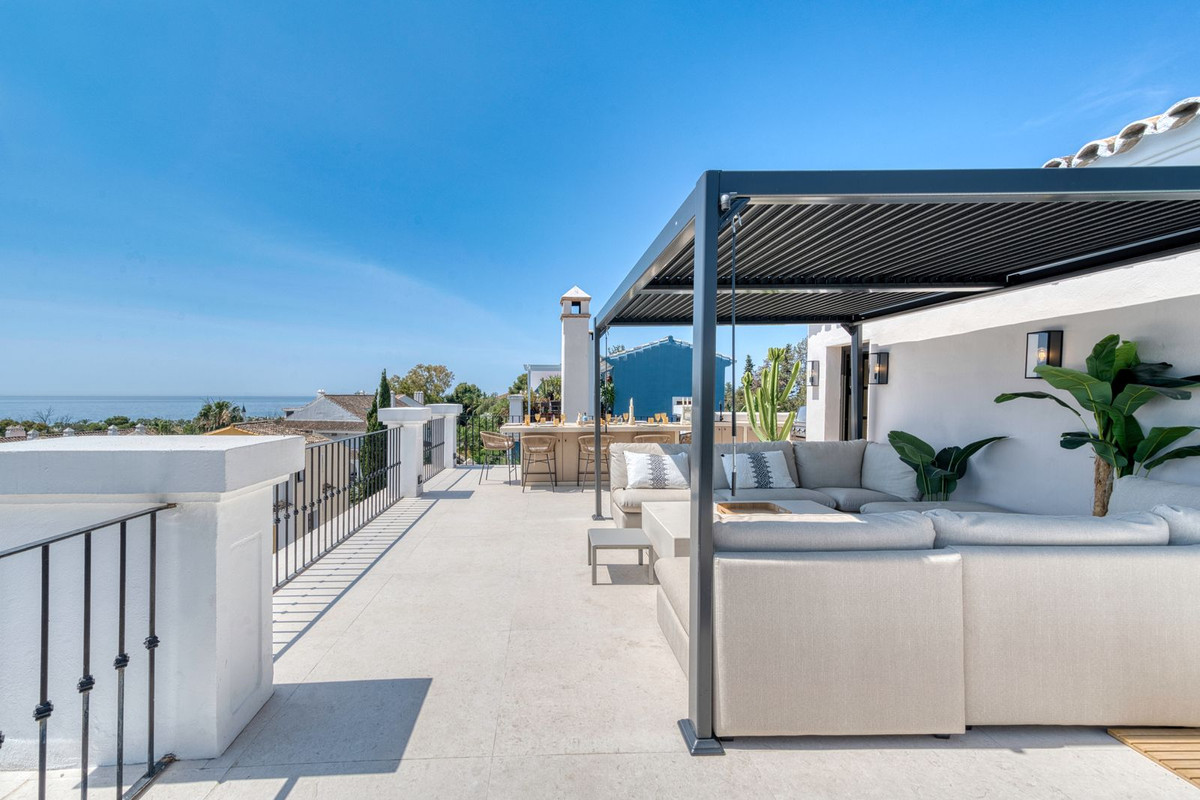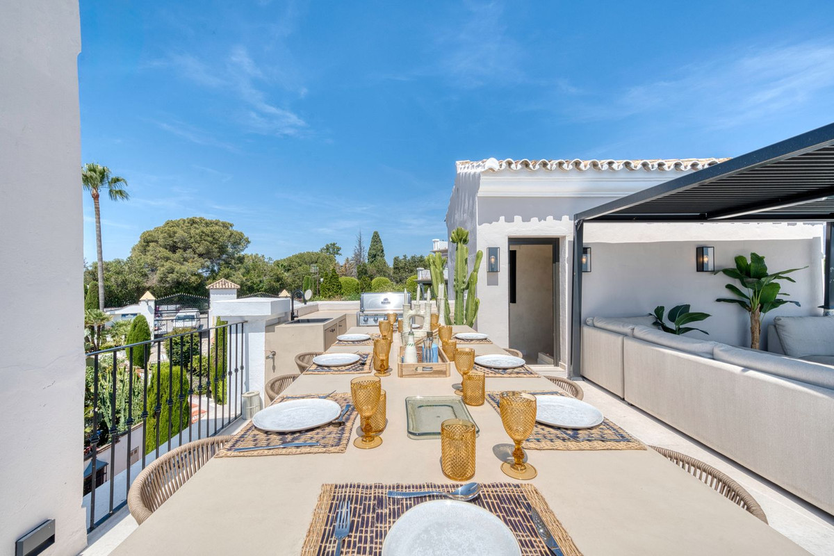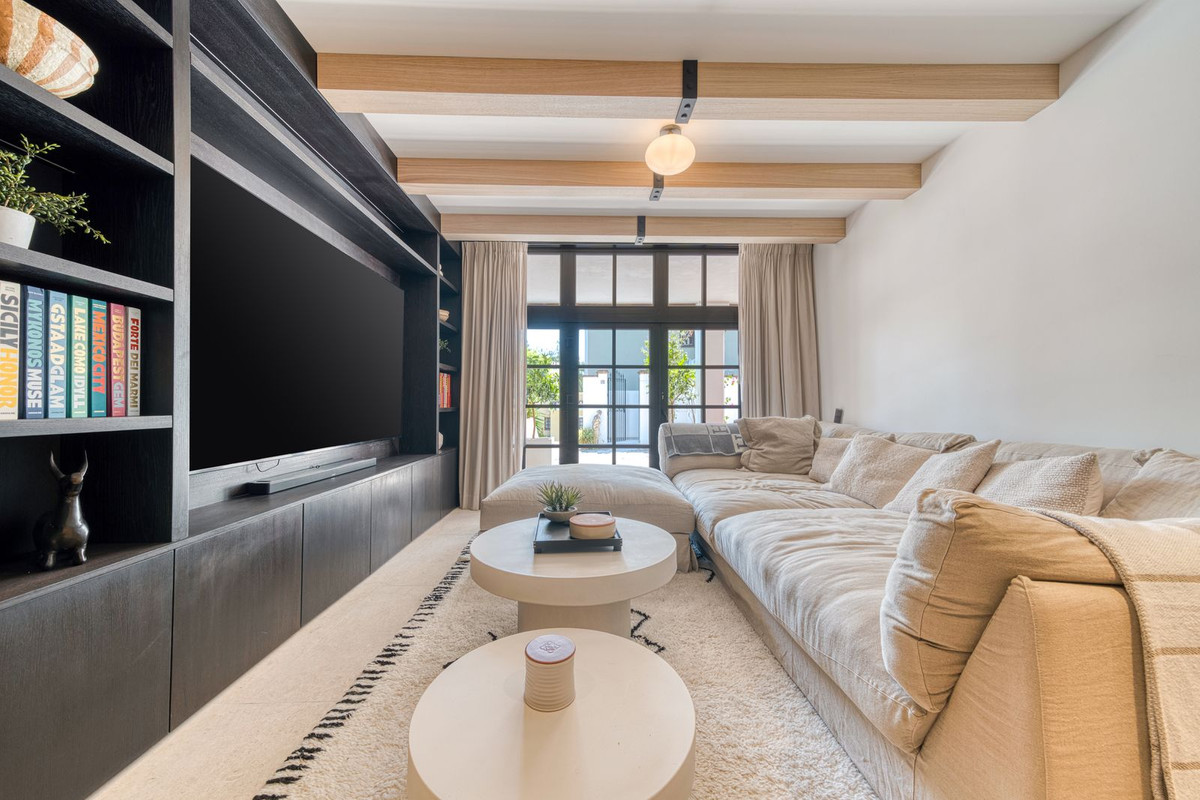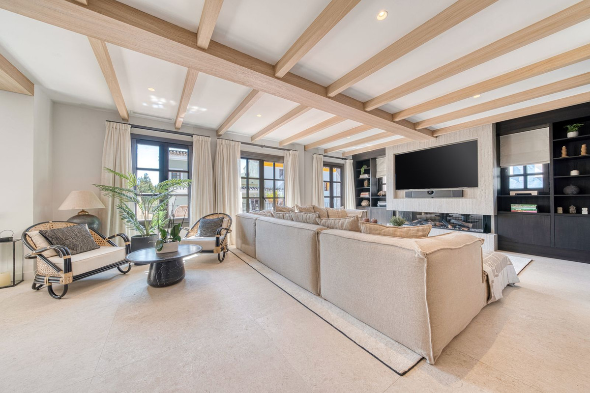 Set within an exclusive gated community on Marbella's Golden Mile, this exquisite townhouse captures the essence of classic Andalusian architecture with a luxurious contemporary edge. Located in the heart of Marbella’s prestigious Golden Mile, it offers total privacy, timeless design, and immediate access to the coast’s most iconic beach clubs and fine dining. The private community gated and secure, low-density community of just 24 homes, surrounded by Mediterranean gardens, cascading fountains, and a sculpted swimming pool. With 24-hour security and on-site maintenance, it offers the peace of a private retreat just moments from the beach and the Paseo Marítimo. You enter this stunning home via a sun-drenched courtyard, ideal for alfresco dining, and step into a home where every detail has been carefully curated. The main floor flows beautifully, featuring a designer kitchen with Gaggenau fitted appliances, a central island, and a generous dining area. The open-plan living room is framed by limed oak ceiling beams and oversized sliding doors that lead onto a spacious terrace, flooding the space with light and connecting indoor and outdoor living. Downstairs, the lower level is all about comfort and entertainment, offering a private cinema lounge with an oversized sofa, a secondary kitchen and bar, wine display, and two beautifully appointed guest suites, each with its own bathroom and access to a covered terrace. Upstairs, the master suite is a tranquil escape with a dressing room, full en-suite bathroom, and a beautiful free standing bathtub. A fourth bedroom completes the level, ideal for family or additional guests. The rooftop terrace is simply show-stopping, with panoramic views stretching from La Concha to the rooftops of Puente Romano, the Mediterranean Sea, and even Gibraltar and North Africa on a clear day. Designed for year-round living, it features a heated plunge pool, BBQ and dining area, and a shaded chill-out lounge, capturing the very best of Marbella’s indoor-outdoor lifestyle.
