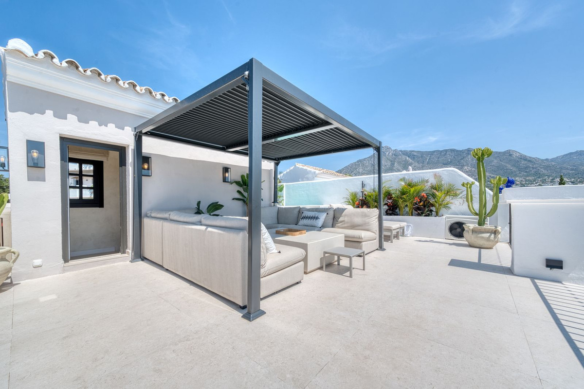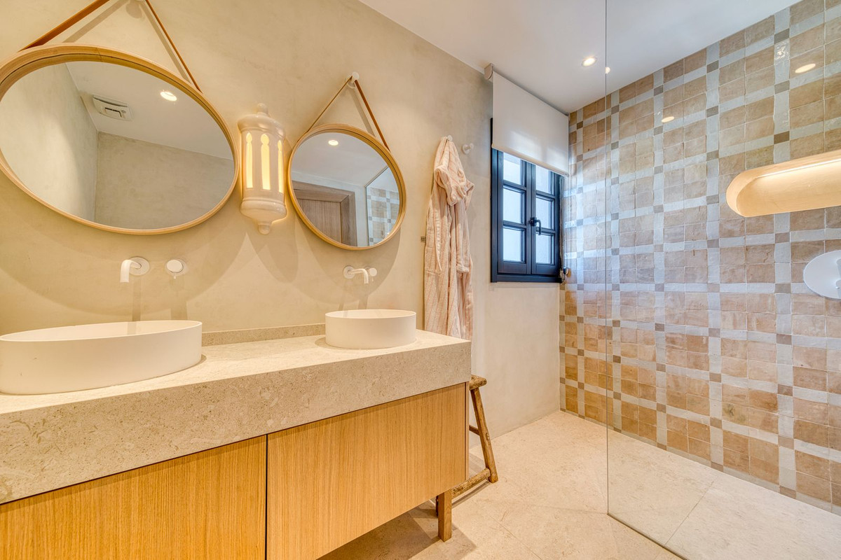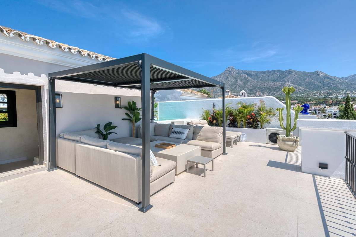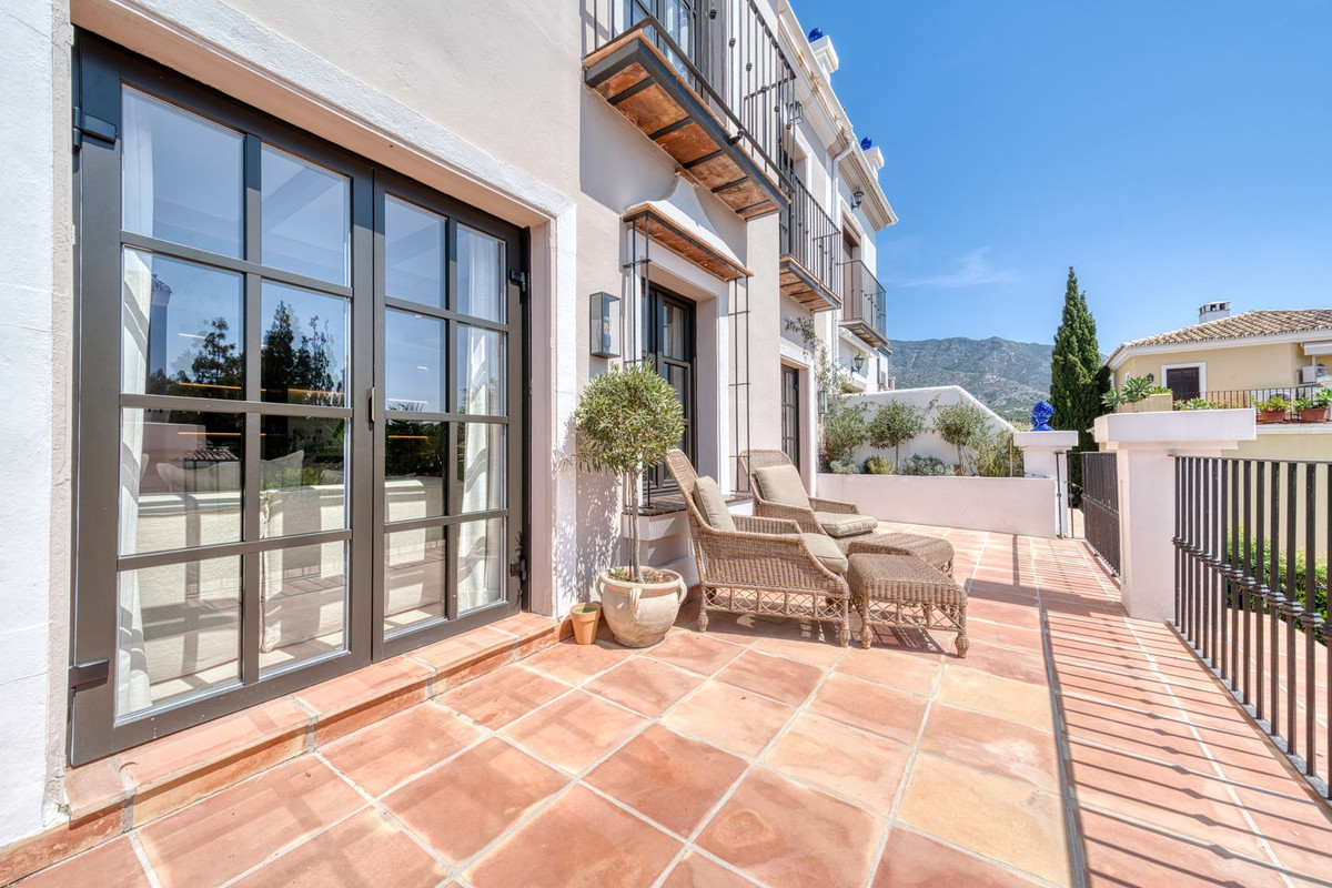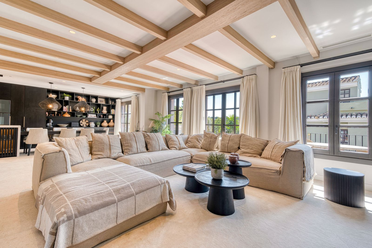 Set within an exclusive gated community on Marbella's Golden Mile, this exquisite townhouse captures the essence of classic Andalusian architecture with a luxurious contemporary edge. Located in the heart of Marbella’s prestigious Golden Mile, it offers total privacy, timeless design, and immediate access to the coast’s most iconic beach clubs and fine dining. The private community gated and secure, low-density community of just 24 homes, surrounded by Mediterranean gardens, cascading fountains, and a sculpted swimming pool. With 24-hour security and on-site maintenance, it offers the peace of a private retreat just moments from the beach and the Paseo Marítimo. You enter this stunning home via a sun-drenched courtyard, ideal for alfresco dining, and step into a home where every detail has been carefully curated. The main floor flows beautifully, featuring a designer kitchen with Gaggenau fitted appliances, a central island, and a generous dining area. The open-plan living room is framed by limed oak ceiling beams and oversized sliding doors that lead onto a spacious terrace, flooding the space with light and connecting indoor and outdoor living. Downstairs, the lower level is all about comfort and entertainment, offering a private cinema lounge with an oversized sofa, a secondary kitchen and bar, wine display, and two beautifully appointed guest suites, each with its own bathroom and access to a covered terrace. Upstairs, the master suite is a tranquil escape with a dressing room, full en-suite bathroom, and a beautiful free standing bathtub. A fourth bedroom completes the level, ideal for family or additional guests. The rooftop terrace is simply show-stopping, with panoramic views stretching from La Concha to the rooftops of Puente Romano, the Mediterranean Sea, and even Gibraltar and North Africa on a clear day. Designed for year-round living, it features a heated plunge pool, BBQ and dining area, and a shaded chill-out lounge, capturing the very best of Marbella’s indoor-outdoor lifestyle.