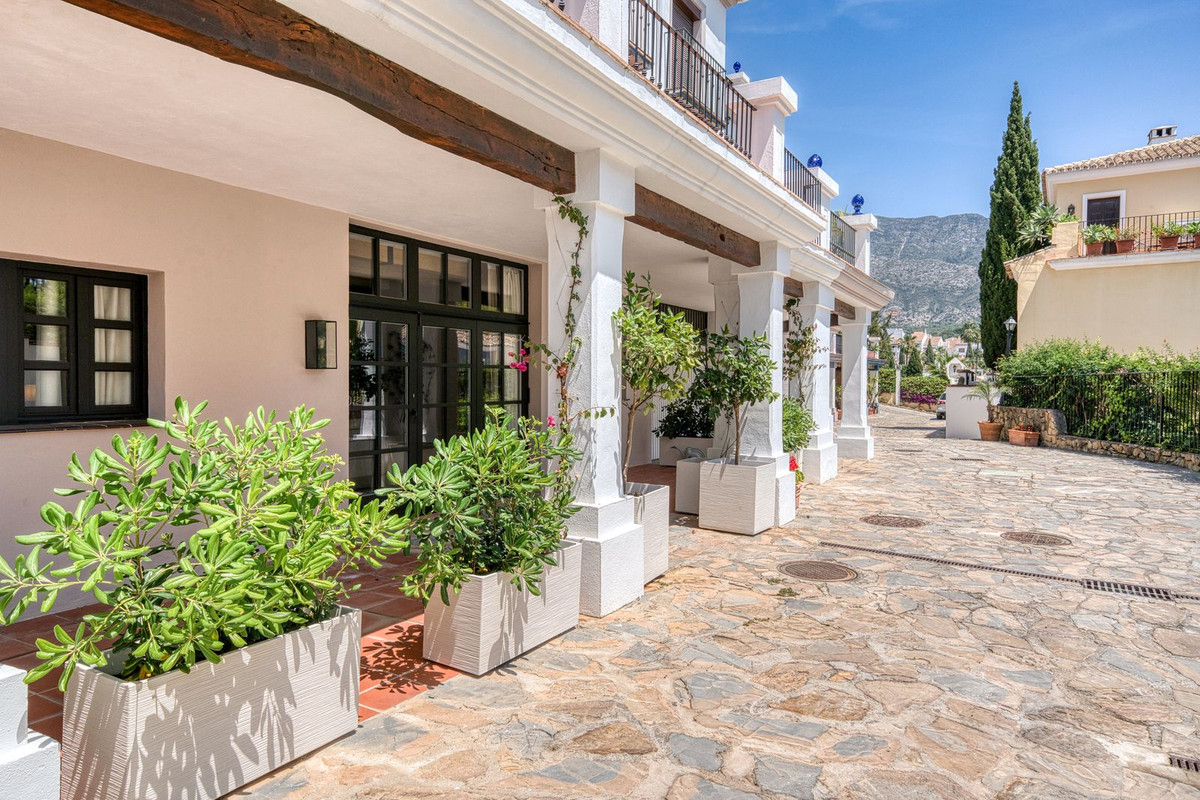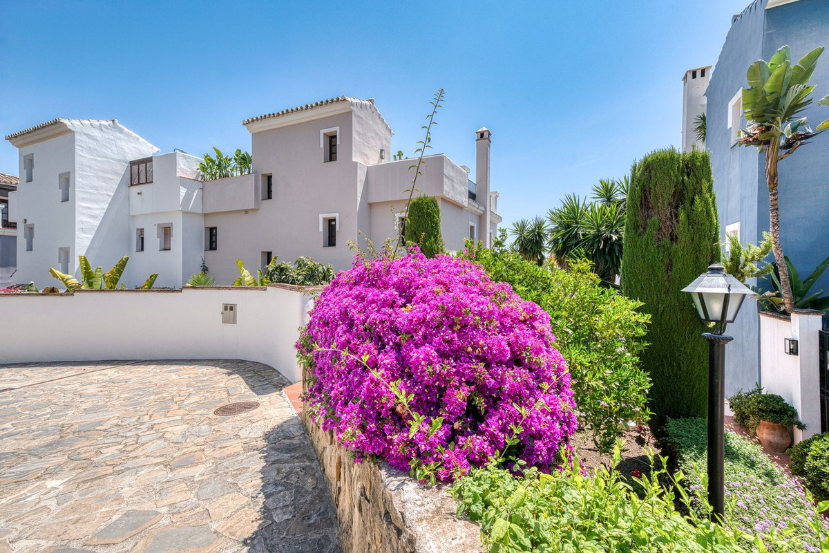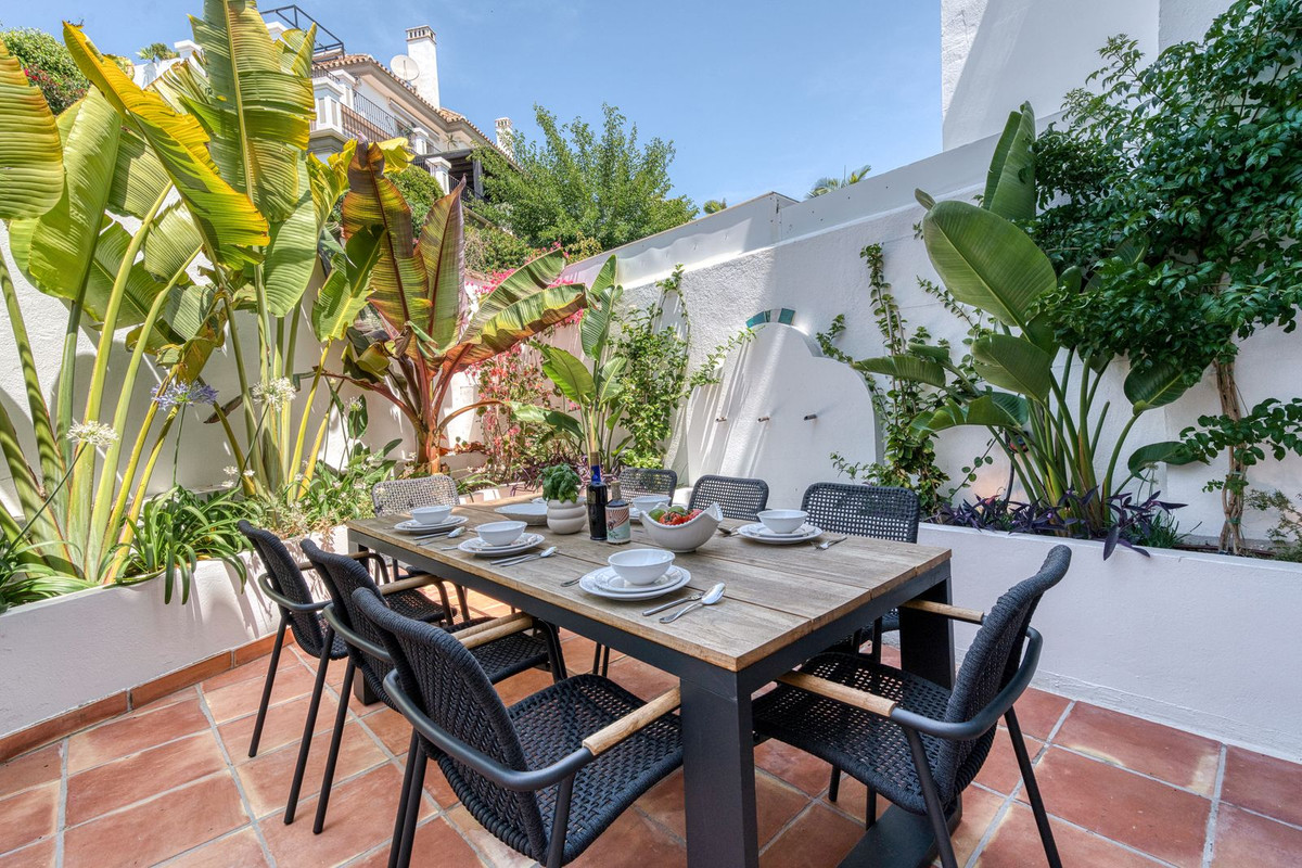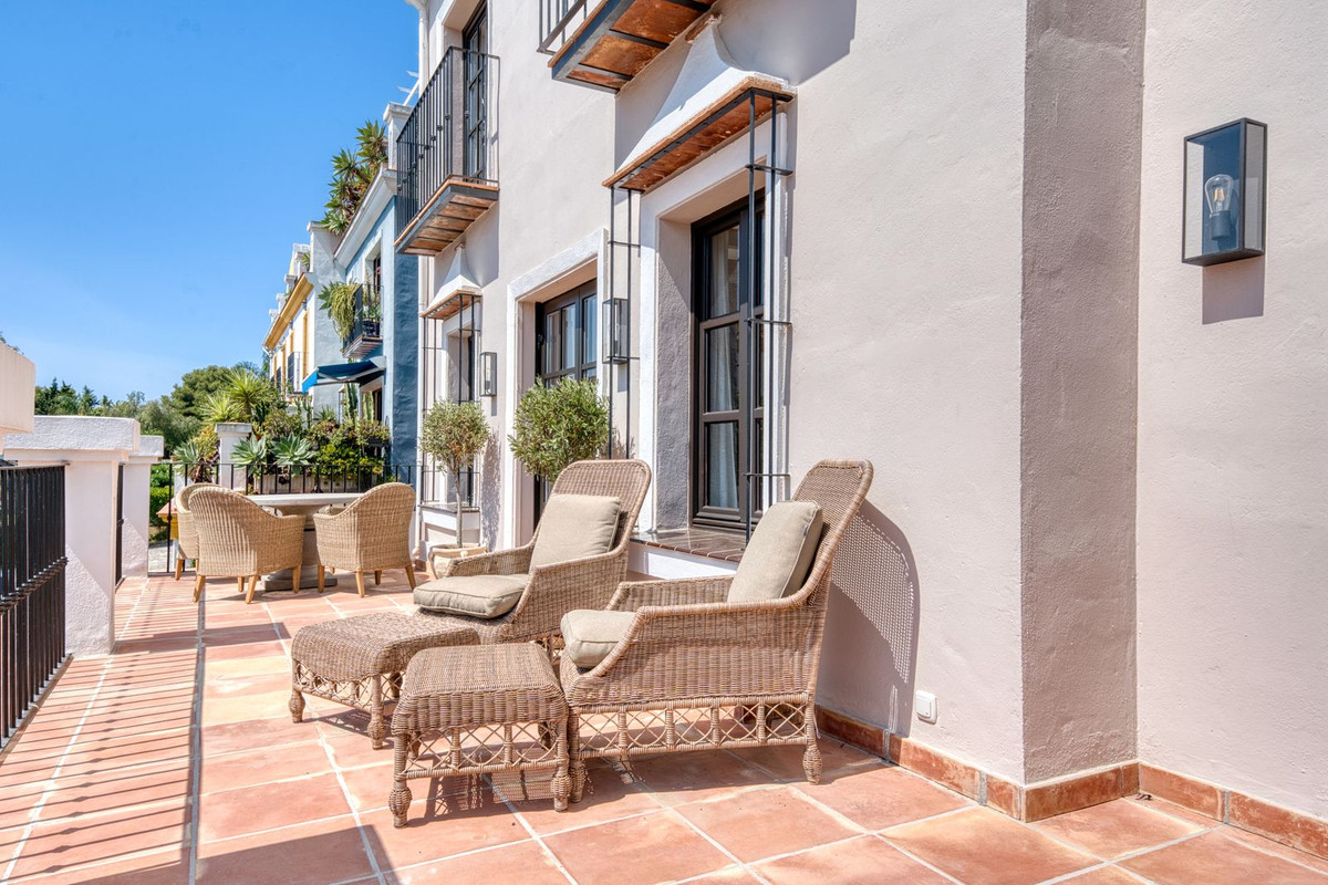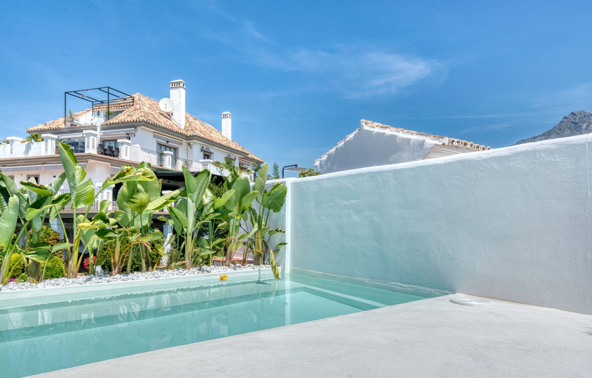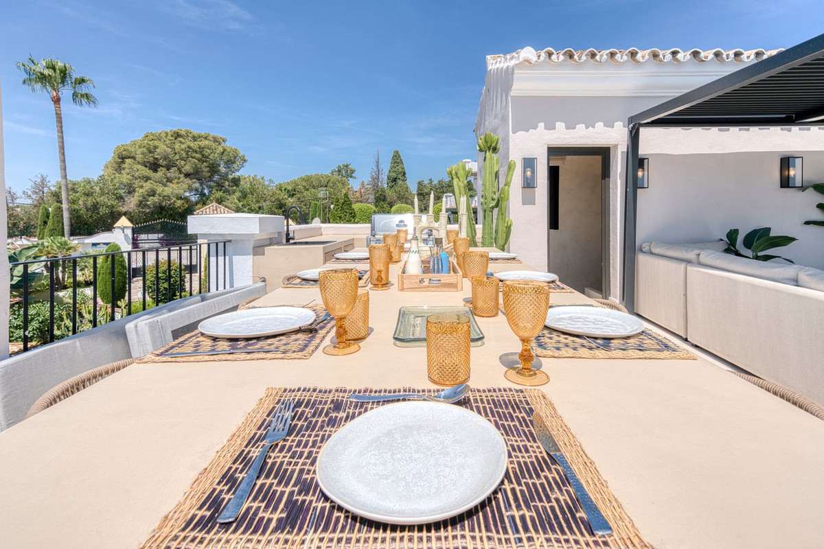 Set within an exclusive gated community on Marbella's Golden Mile, this exquisite townhouse captures the essence of classic Andalusian architecture with a luxurious contemporary edge. Located in the heart of Marbella’s prestigious Golden Mile, it offers total privacy, timeless design, and immediate access to the coast’s most iconic beach clubs and fine dining. The private community gated and secure, low-density community of just 24 homes, surrounded by Mediterranean gardens, cascading fountains, and a sculpted swimming pool. With 24-hour security and on-site maintenance, it offers the peace of a private retreat just moments from the beach and the Paseo Marítimo. You enter this stunning home via a sun-drenched courtyard, ideal for alfresco dining, and step into a home where every detail has been carefully curated. The main floor flows beautifully, featuring a designer kitchen with Gaggenau fitted appliances, a central island, and a generous dining area. The open-plan living room is framed by limed oak ceiling beams and oversized sliding doors that lead onto a spacious terrace, flooding the space with light and connecting indoor and outdoor living. Downstairs, the lower level is all about comfort and entertainment, offering a private cinema lounge with an oversized sofa, a secondary kitchen and bar, wine display, and two beautifully appointed guest suites, each with its own bathroom and access to a covered terrace. Upstairs, the master suite is a tranquil escape with a dressing room, full en-suite bathroom, and a beautiful free standing bathtub. A fourth bedroom completes the level, ideal for family or additional guests. The rooftop terrace is simply show-stopping, with panoramic views stretching from La Concha to the rooftops of Puente Romano, the Mediterranean Sea, and even Gibraltar and North Africa on a clear day. Designed for year-round living, it features a heated plunge pool, BBQ and dining area, and a shaded chill-out lounge, capturing the very best of Marbella’s indoor-outdoor lifestyle.